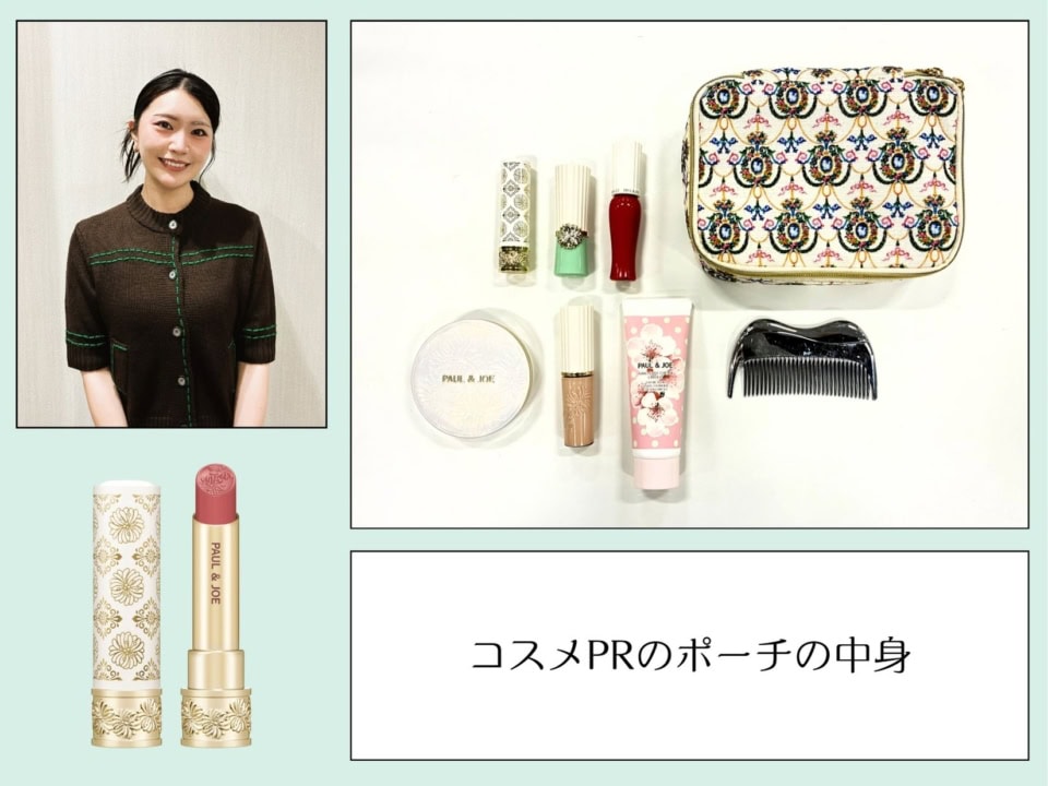 「ポーチは2025年ポール & ジョー ボーテのクリスマスアイテム。マチもしっかりあり、お化粧直し用のアイテムやハンドクリームなどもしっかり入ります! 見た目も華やかで鞄から取り出すたび、心が躍ります。ポーチの中身は、室内外の両方を行き来することも多いのでベースのお直しアイテム+気分転換用にリップを数種類。リップはその日のメイクに合わせて色を変えて持ち歩いています。乾燥時期にハンドクリームも必須。この先の新製品を普段から使いこんでいます」