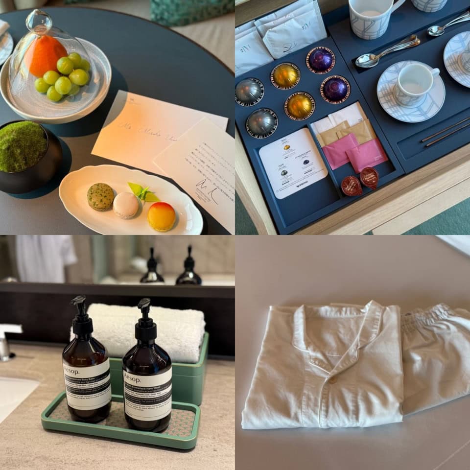 今回私が宿泊したのは「デラックスルーム」。50平米弱の広々とした客室からは、大阪のシティビューが望めます! 「魔法のような瞬間、本物の体験をお手伝いさせていただきます」そんなメッセージにうっとり♡ バスアメニティはイソップ、ドライヤーはダイソン、上下セパレートタイプのルームウェア。美容感度の高いゲストも大満足です! また、ウェルカムフルーツ&マカロン、コーヒーやお茶に食器、ナイトキャップのチョコレート……。全てがお洒落すぎ。