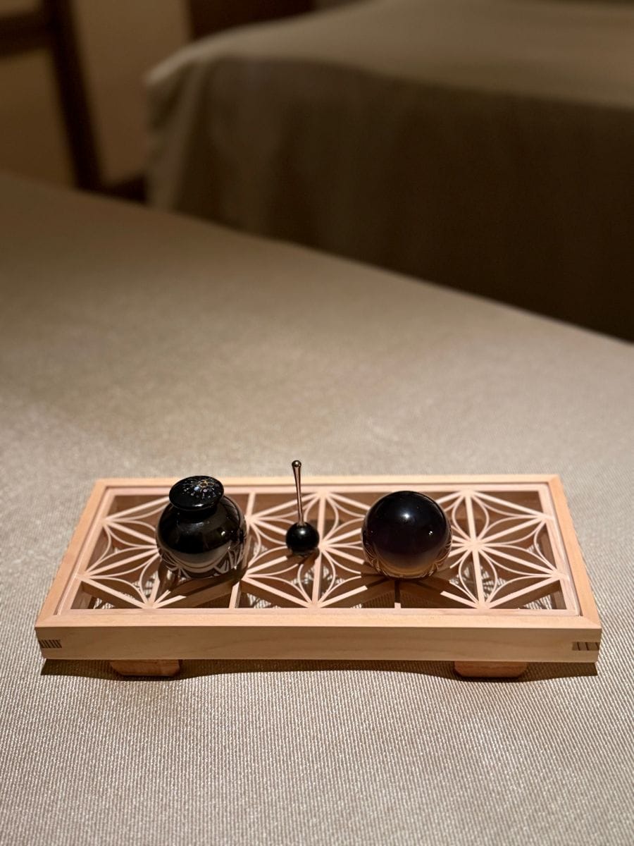アサイとザクロのウェルカムティーを飲んだあと、プライベートルームへ。富山県で作られている久乗おりんの音が、からだ全体をやさしく包み込むかのように副交感神経を優位に。