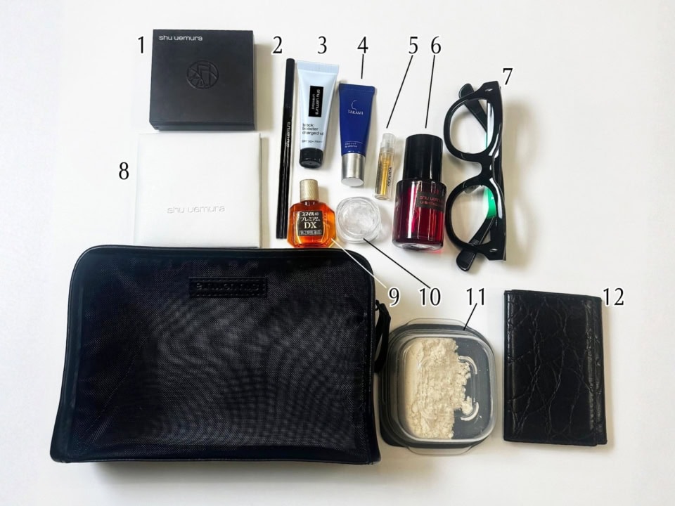 美意識の高い方々と接する仕事なので、ポーチに入れるアイテムは自分の良い状態をキープしてくれて、イケオジ感を演出するためのメイク直しや保湿ができるものがマスト。出先で使いやすいシンプルで機能性の高いアイテムを厳選しています」