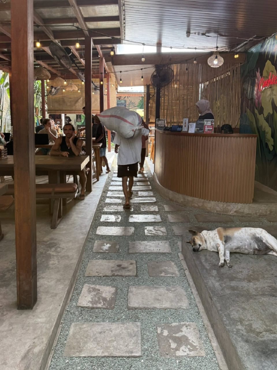 街中のジムに併設されたカフェ。南国ムードにわんこもリラックスしております