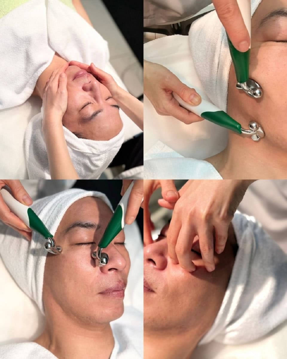 施術に使用するマリコールの化粧品だけでなく「カチオビタル リフト」というフランスで作られた独自マシーンを使用します。下から上へ引き上げる筋肉刺激と上から下へ毒素を排出。おでこから法令線、フェイスラインのたるみに働きかけてリフトアップ。小さなヘッドがついたマシーンはピンポイントで施術できるから顔全体はもちろん、目元の細かいたるみ部分までアプローチできるんです。最初に「終わったらすっきりと骨格が綺麗に出ますよ」と嬉しい宣言を受けて施術スタート。