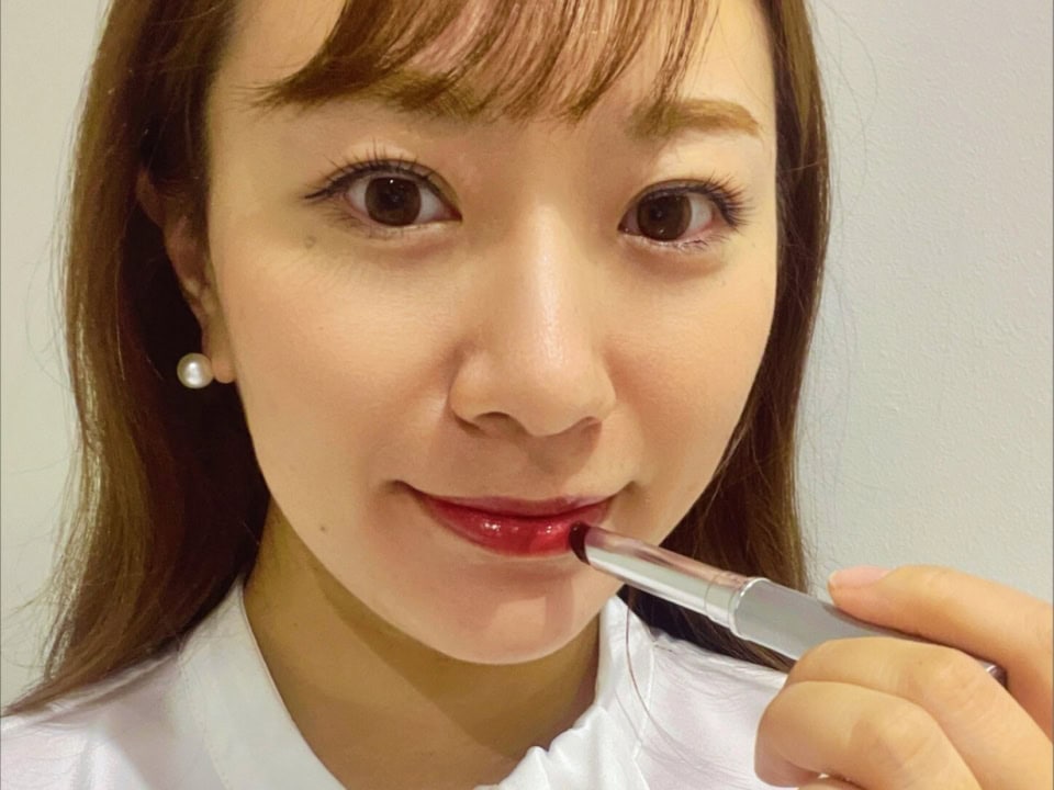 「唇にするするとなじませるだけで血色感のあるリップに。鏡いらずでさっとつけられるので、ポーチやデスクなどに常に常備しています」