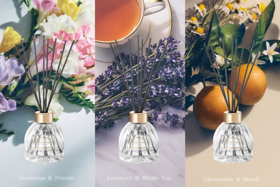 その時の気分や置きたい場所に合わせて選べる3つの香りが用意されています。朝のフラワーマーケットのように清々しい「ゼラニウム&フリージア」は、アップルやペアーの甘みにカシスが重なるフルーティフローラルの香りで、在宅ワーク中のデスク回りなど、リフレッシュして集中力を高めたい空間にぴったりです。穏やかなティータイムを思わせる「ラベンダー&ホワイトティー」は、清潔感のあるフローラルムスクが特徴で、仕事終わりの玄関やお部屋に上質な洗練をもたらしてくれます。そして、深い温もりに包まれる「カモミール&ネロリ」は、レモンなどの柑橘と穏やかなハーブが溶け合うシトラスフローラル。ゆったり過ごすリビングや、一日の終わりに安らぎたい寝室にそっと寄り添ってくれます。