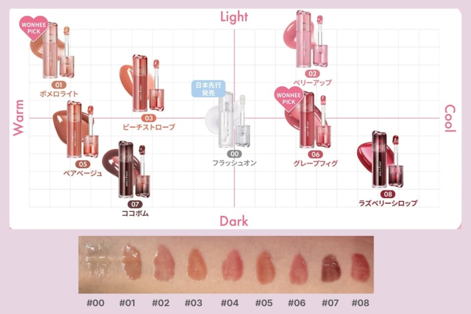 日本では04番を除いた8色を発売。その中でも、特に大人世代におすすめしたいのが、05番の「ペアベージュ」や06番の「グレープフィグ」です。これらは大人の肌をパッと明るく見せてくれる落ち着いたミュートカラーで、今の私たちが求めている「やりすぎない血色感」を叶えてくれます。単体でナチュラルに楽しむのはもちろん、手持ちのリップに重ねるだけで、旬の透明感と奥行きを一気にアップデートできます。また、日本先行発売となる00番の「フラッシュオン」はプランパー効果を備えており、乾燥対策をしながら心地よい刺激で唇を整え、ふっくら上向きな印象を与えてくれる、まさに大人のための実力派アイテムです。