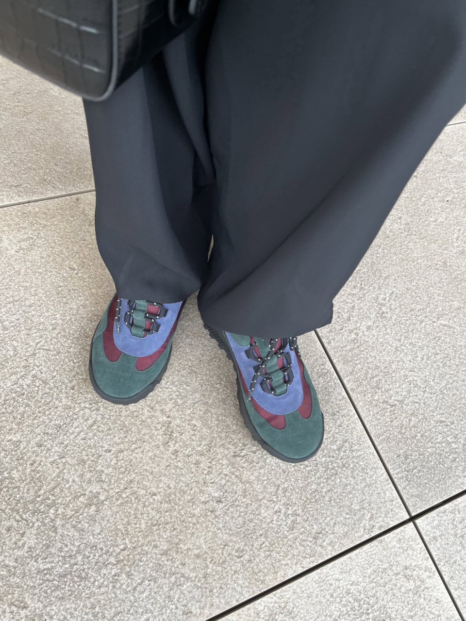 「PurpredのTRACK SNEAKERSは、見た目以上にとっても軽くて合わせやすい色使いがポイント。ベーシックカラーを使ったスタイリングのポイントになり、曲線的なカッティングを取り入れたデザインがエレガントな雰囲気にまとめてくれるところも気に入っています」スニーカー¥35,200(Purpred)