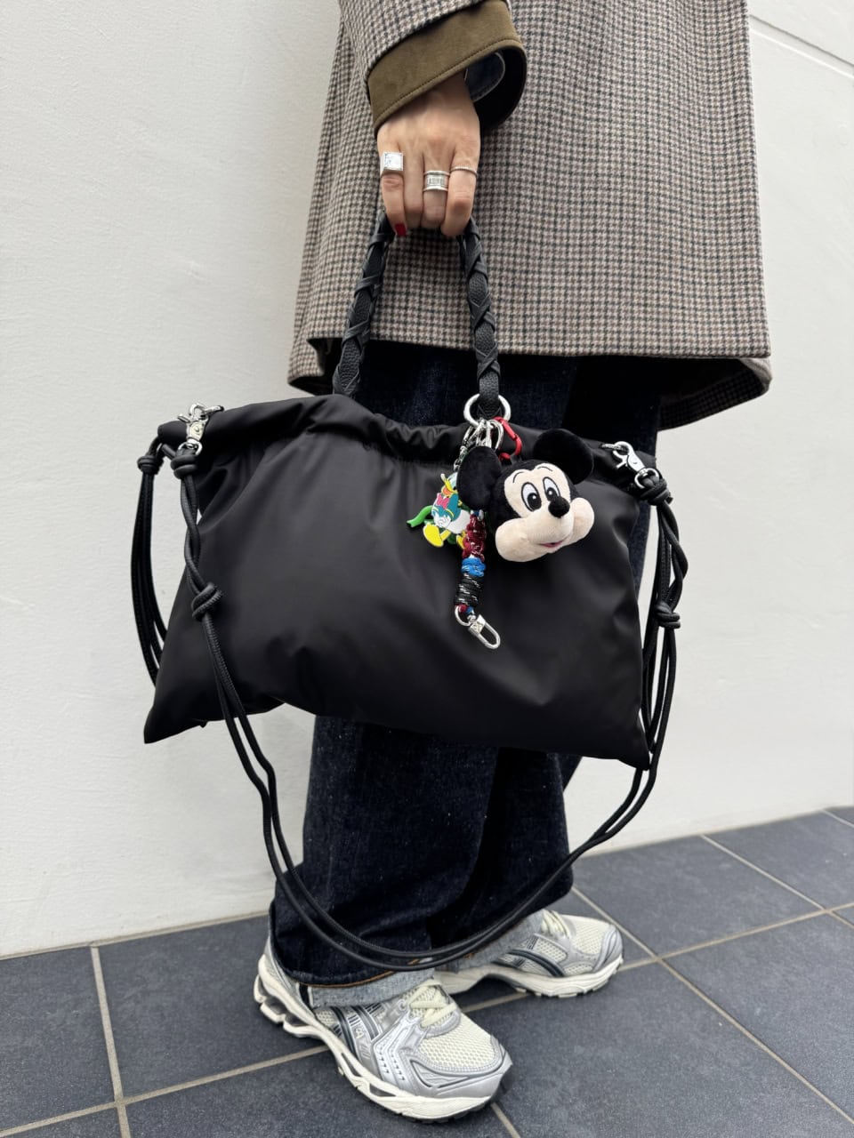 アシックスのスニーカーは本人私物、ジャケット¥75,900(ヴェニット)、パンツ¥27,500(ボニーウーブン)、バッグ¥20,900(リンク)、ミッキーのチャーム¥6,590(ザラ×ハリーランバート×ディズニー)、ミュウミュウのアイウエア、デニムシャツ、その他は全て本人私物