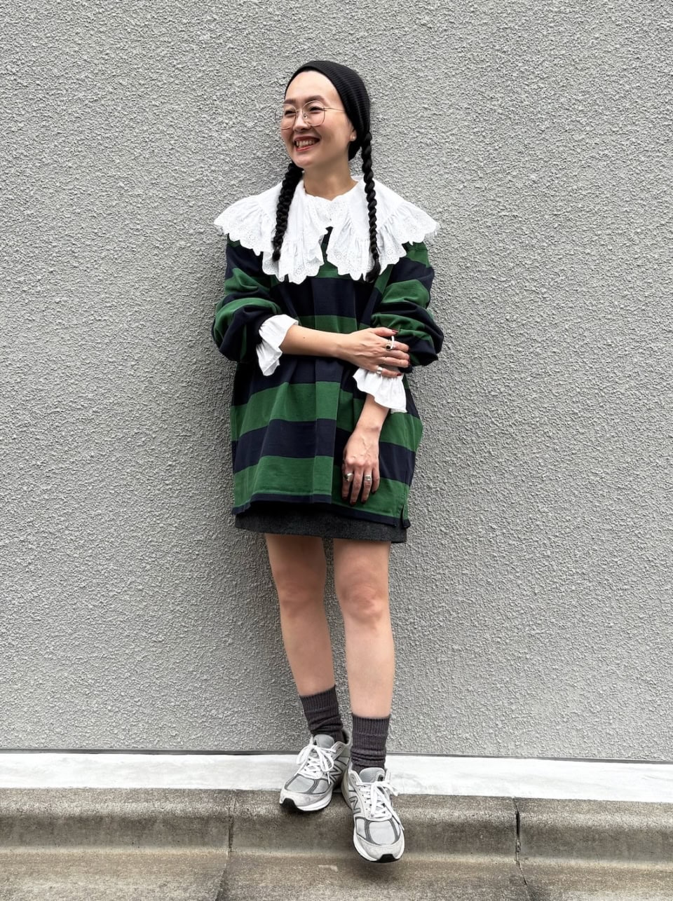 「オーバーサイズの古着のラガーシャツからミニスカートをチラリ。カジュアルスタイル×フリルブラウスと、ボリュームのあるニューバランスのスニーカーにミニ丈のバランスがポイントです。今の季節しかできない、長袖とショートボトムにスニーカーのスタイリングがお気に入り!」