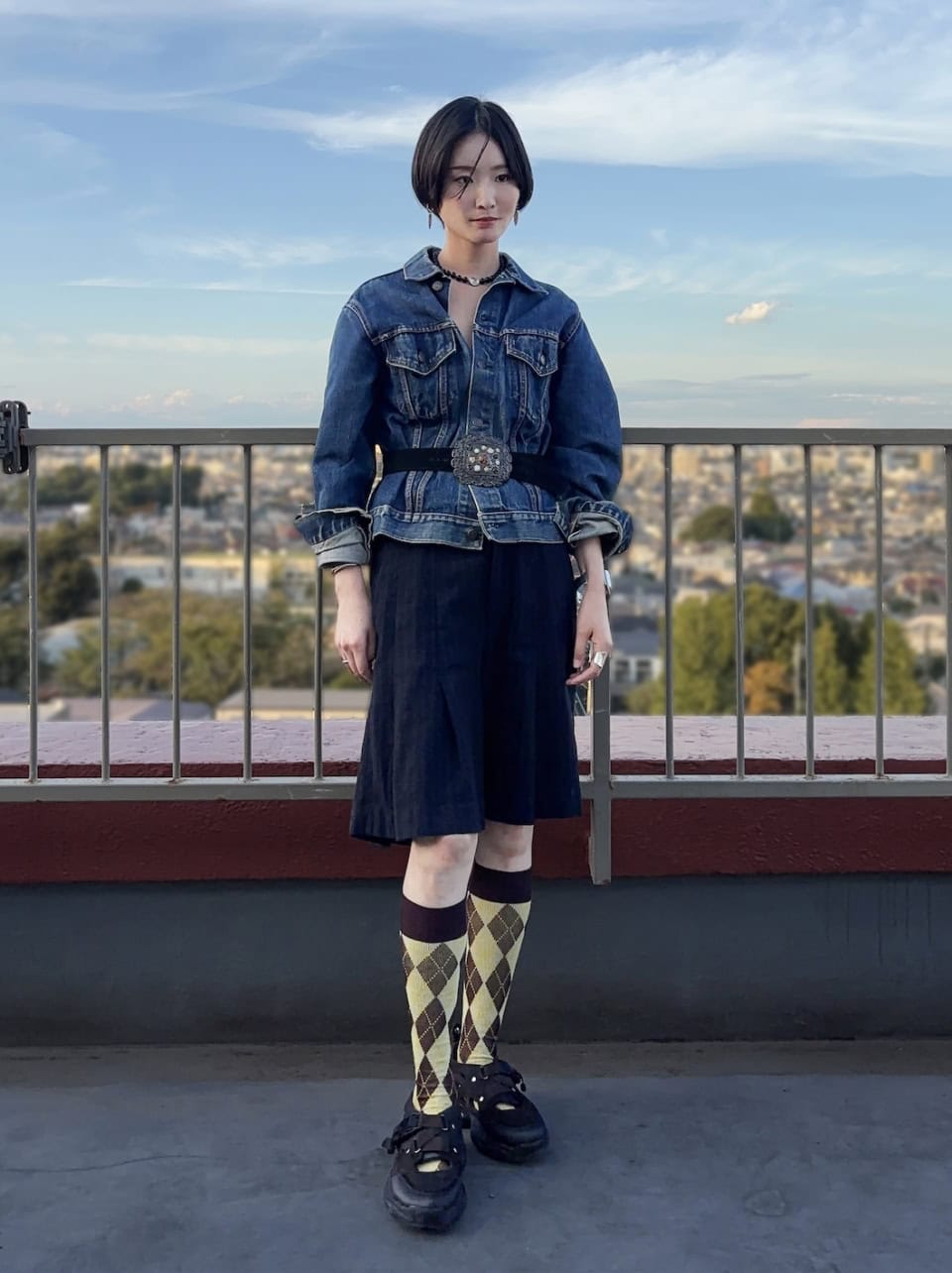 「やっと涼しくなり、ライトアウターが着れるようになって嬉しいこのごろ。デニムジャケットにヴィンテージのベルトを合わせたスタイルがマイブームです。OAOのモードなスニーカーを取り入れてスタイリング全体を引き締め、アーガイル柄のソックスで秋らしさを意識したのがポイントです」