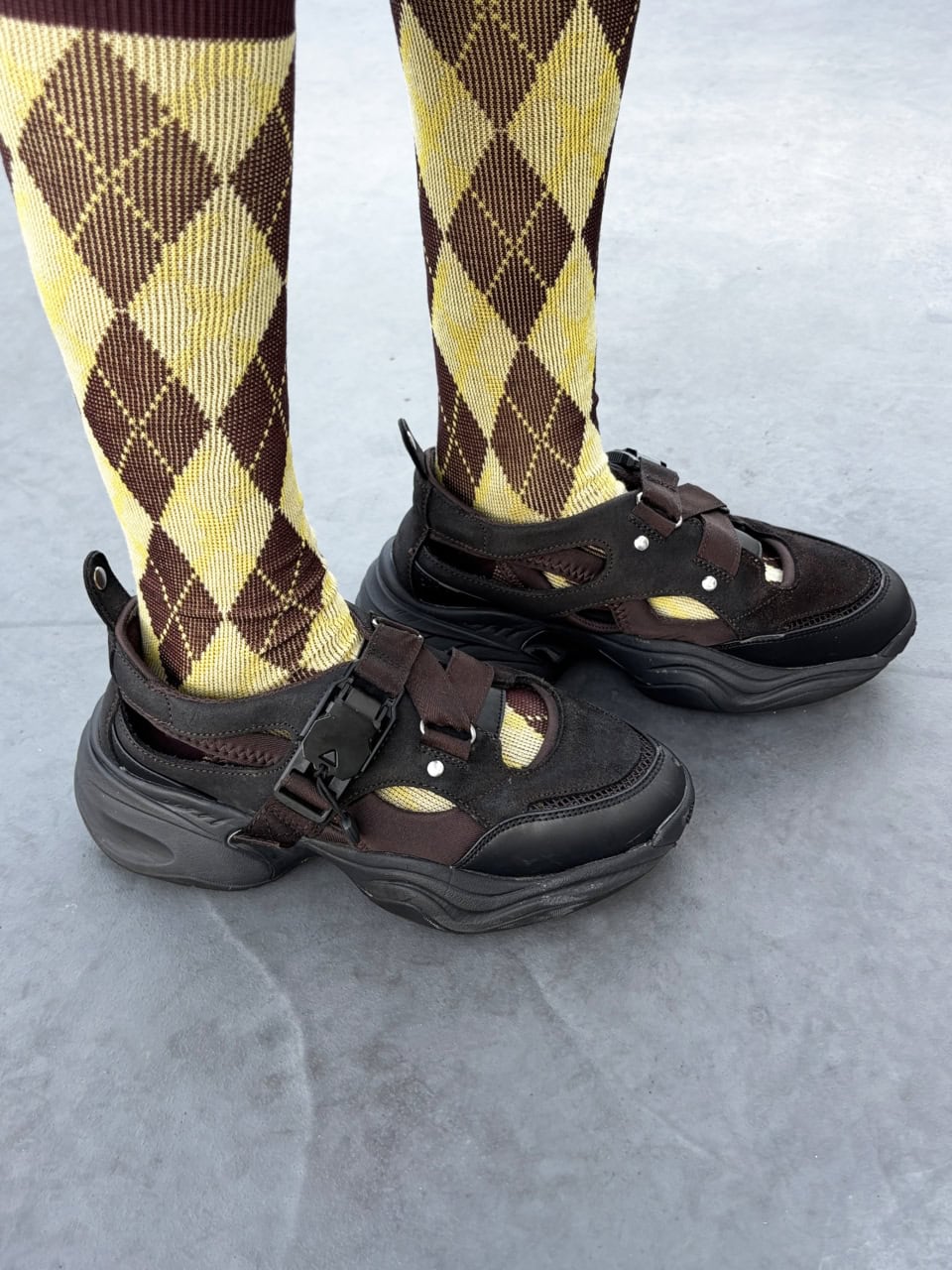 「靴紐でもファスナーでもなく、バックルで留めるテック感のあるデザインがお気に入りのスニーカー。配色がブラック×ブラウンなので、どんな服の色にも合わせやすく万能です」オーエーオーのスニーカーは本人私物