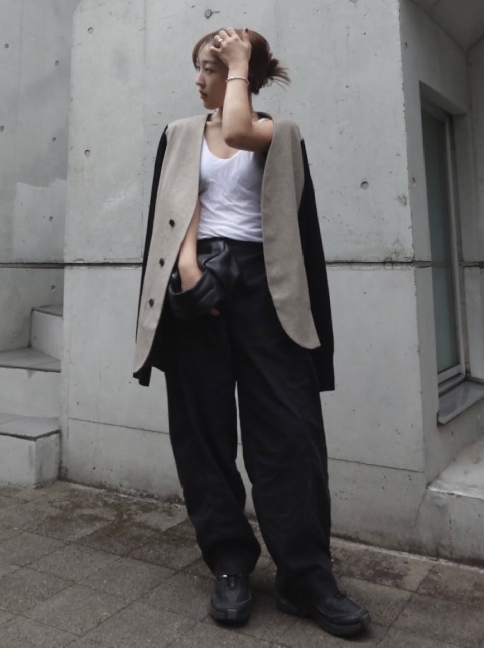「スニーカーを合わせるときは、ラフになりすぎないようなスタイリングを意識しています。今回はモードなジャケットを合わせ、低身長なので適度な肌見せをすることでヌケ感を出しました」