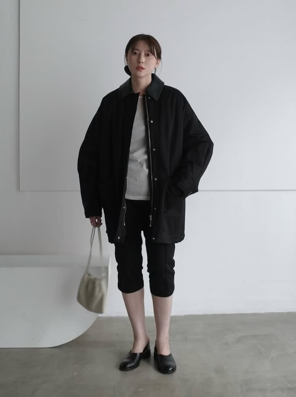 「配色にした合皮の襟や大きめのポケットなどディテールにもこだわり、素材感とカラーが秋の気分を上げてくれるジャケット。中綿入りでポリエステルの裏地付きなので防寒として寒い日にも着られます」ジャケット¥35,200(マノフ)