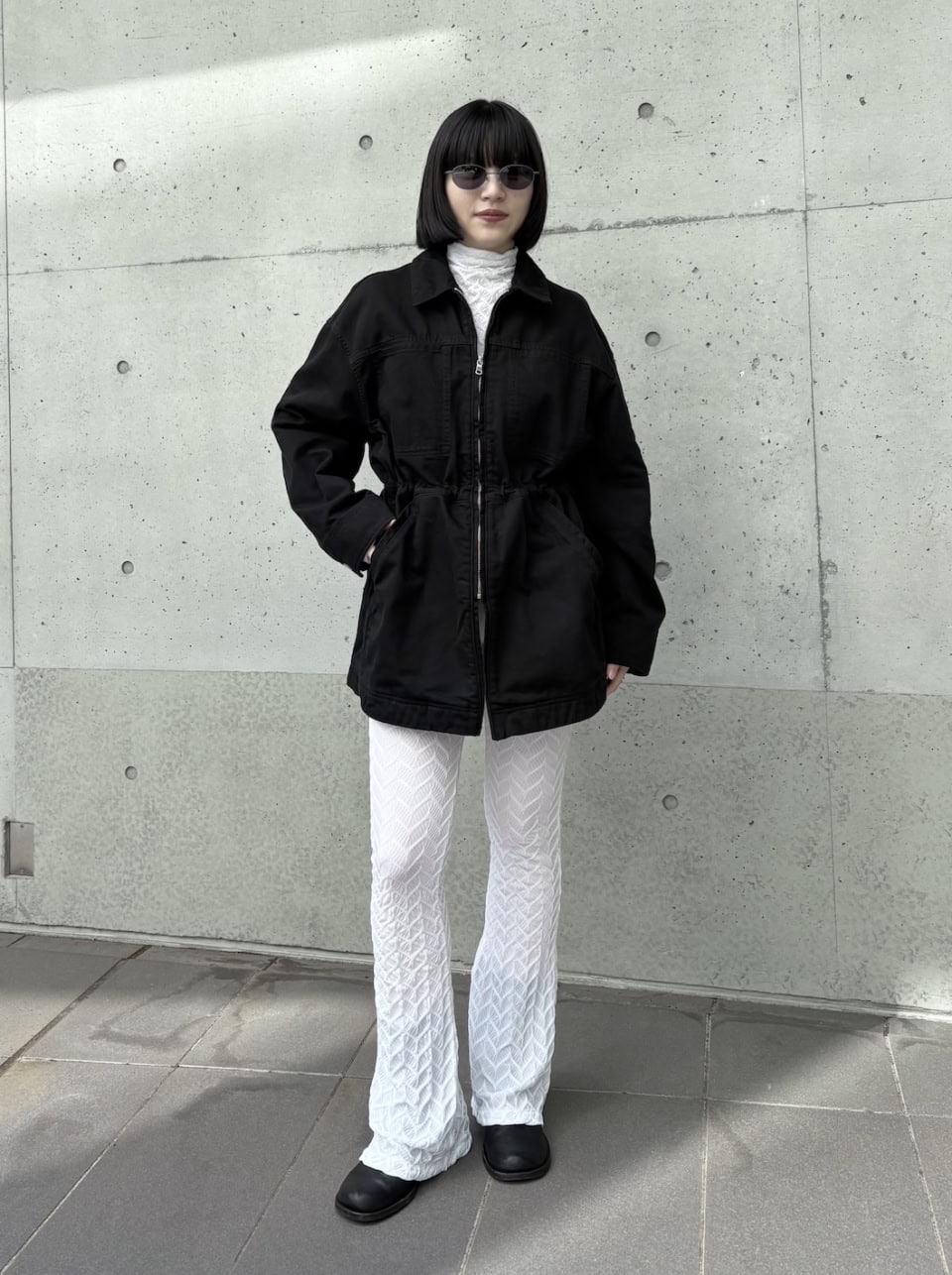 「ジャケットはトゥ エ モン トレゾア × ヨー ビオトープのもの。女性のためのデニムを作っているトゥ エ モン トレゾアとの別注アイテムです。4回目のコラボレーションで、今回は初めてジャケットを作りました。オーバーサイズなジャケットのウエストをあえて強く絞って強調させ、スタイルアップして見えるように意識しています。秋冬はファッションのトーンが暗くなりがちですが、真っ白なアイテムと合わせて、モノトーンだけど華やかな印象に。トップスとパンツはシェル柄でフェミニンな印象なので、メンズライクなサングラスとブーツを取り入れることでバランスを意識しています」