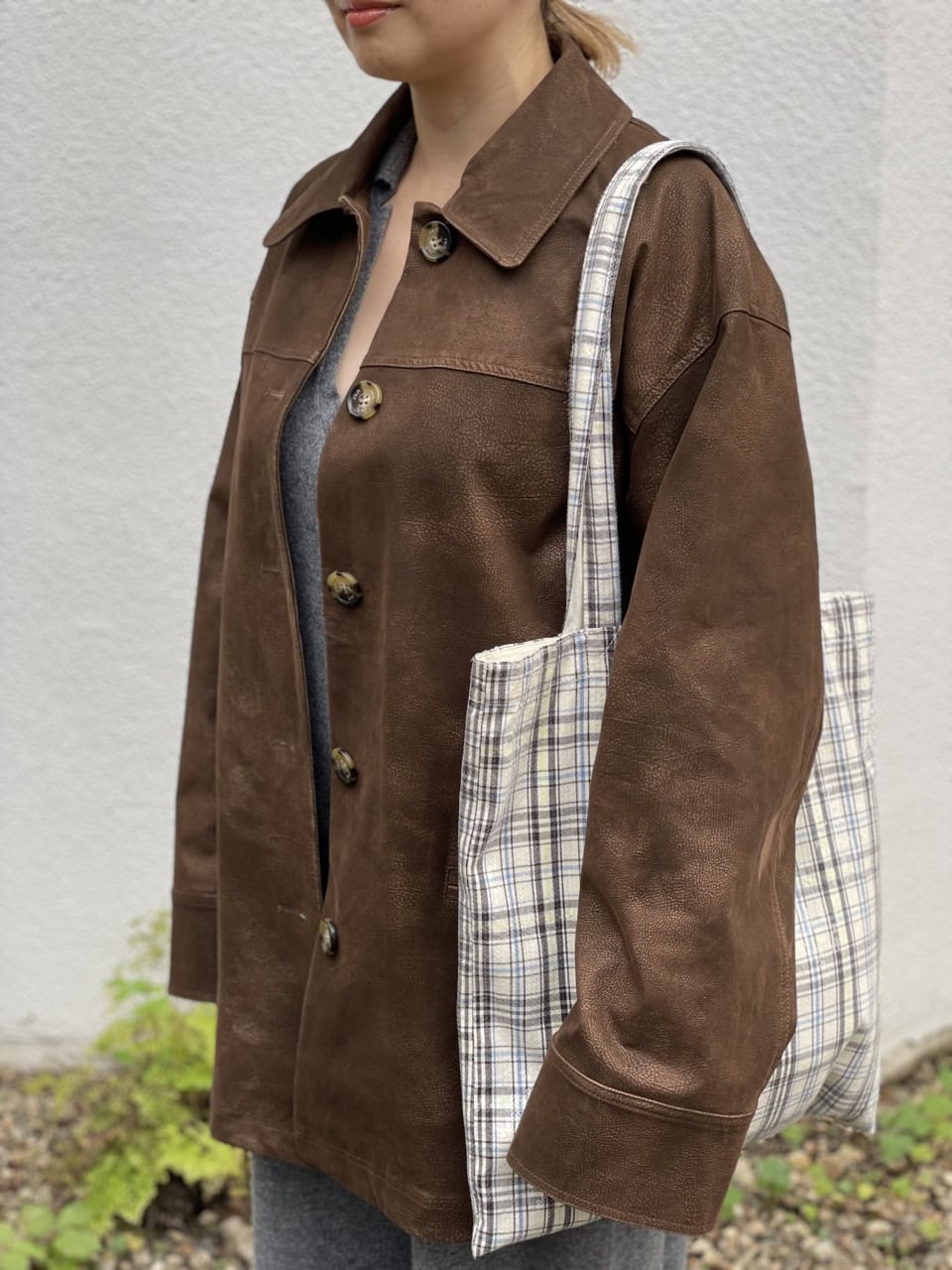 ジャケット¥49,500、オールインワン¥38,500、トートバッグ¥6,930(全てウーア)、ジルサンダーのショルダーバッグ、VANSのスニーカー、その他は全て本人私物