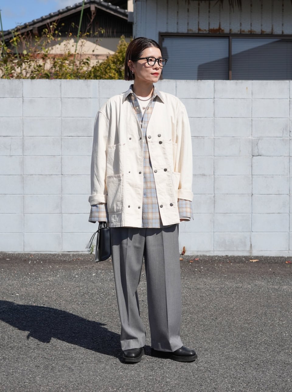 ジャケット¥46,200(THE SHINZONE)、シャツ¥52,800(オーラリー)、バック ¥33,000(ピエニ/全てChum!)、オーラリーのシューズ、EYEVANのアイウェア、ラムーンのネックレスとピアスは全て本人私物