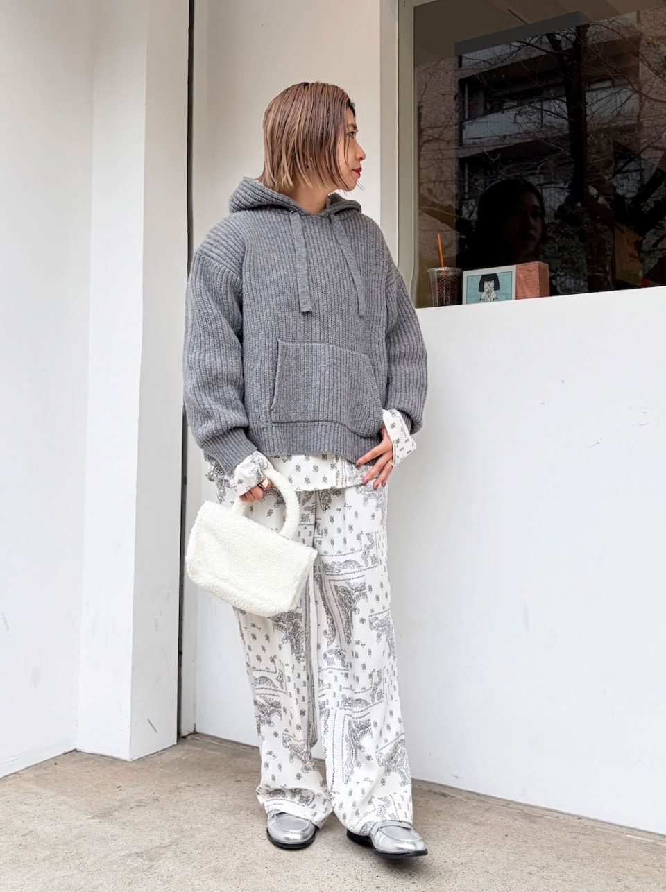 「ふっくらとしたあぜ編みのニットフーディを主役に、グレーからホワイトのニュアンスのあるトーンでまとめました。中に着たのは、スペイン発の子ども服ブランド『The New Society』から派生し、今季デビューしたウィメンズラインのセットアップ。バンダナ柄のシャツとパンツは一見インパクトがありますが、ニットフーディを重ねることで程よくトーンダウンしてくれます。足元はシルバーのローファーを合わせて、大人カジュアルに仕上げました」