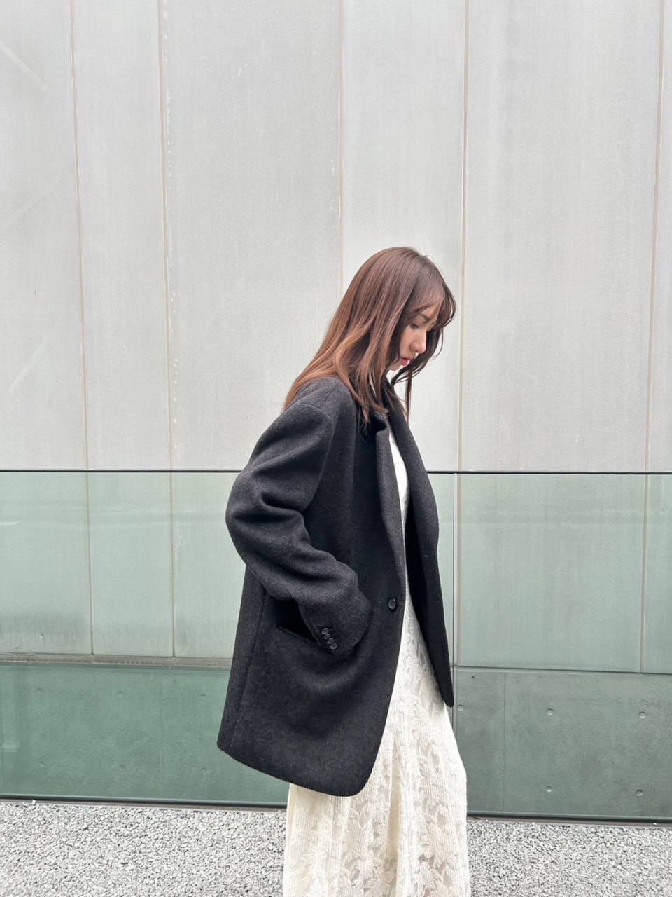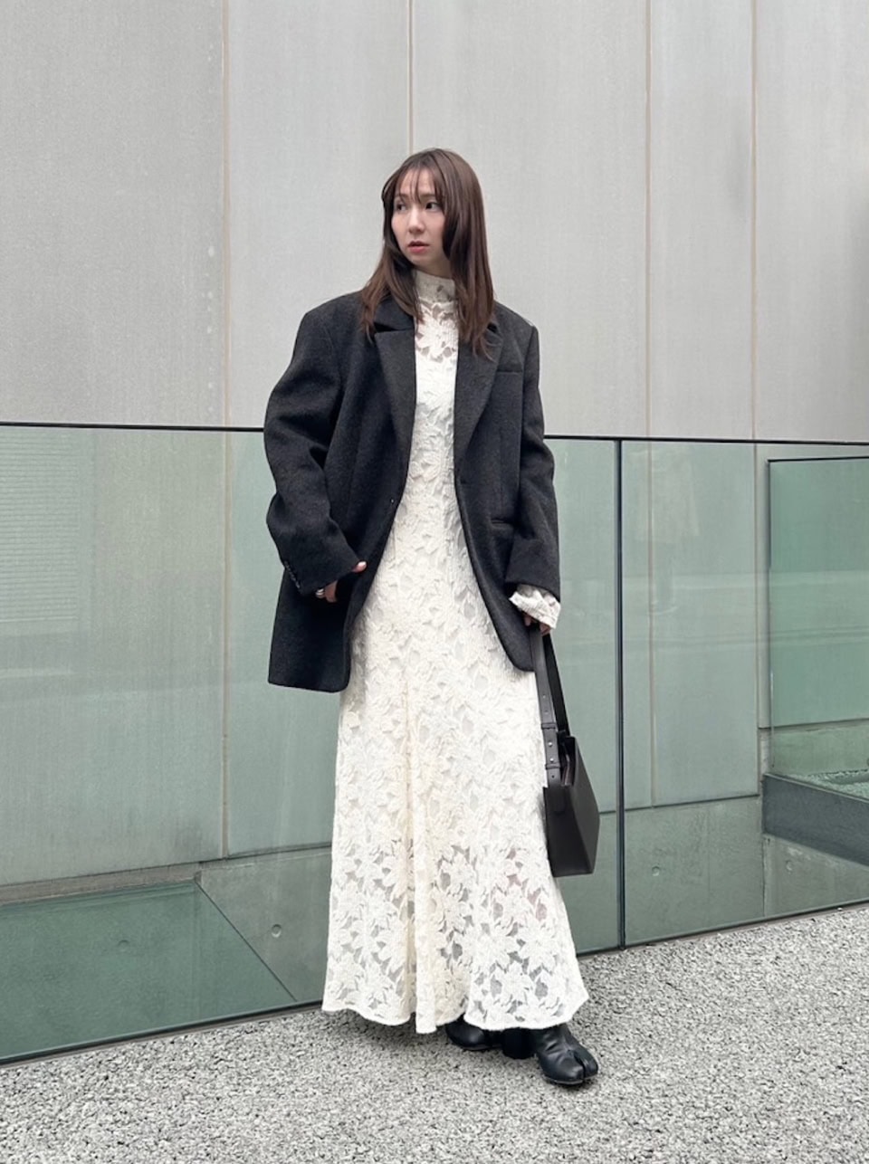 「グレーのジャケットの中にはホワイトのワンピースを合わせ、小物は落ち着きのある色を選ぶことでモードな要素をプラスしました。ジャケットが少しオーバーなシルエットなので、ワンピースと合わせても甘くなり過ぎず、どんなコーデでもサマになるのがお気に入りです」