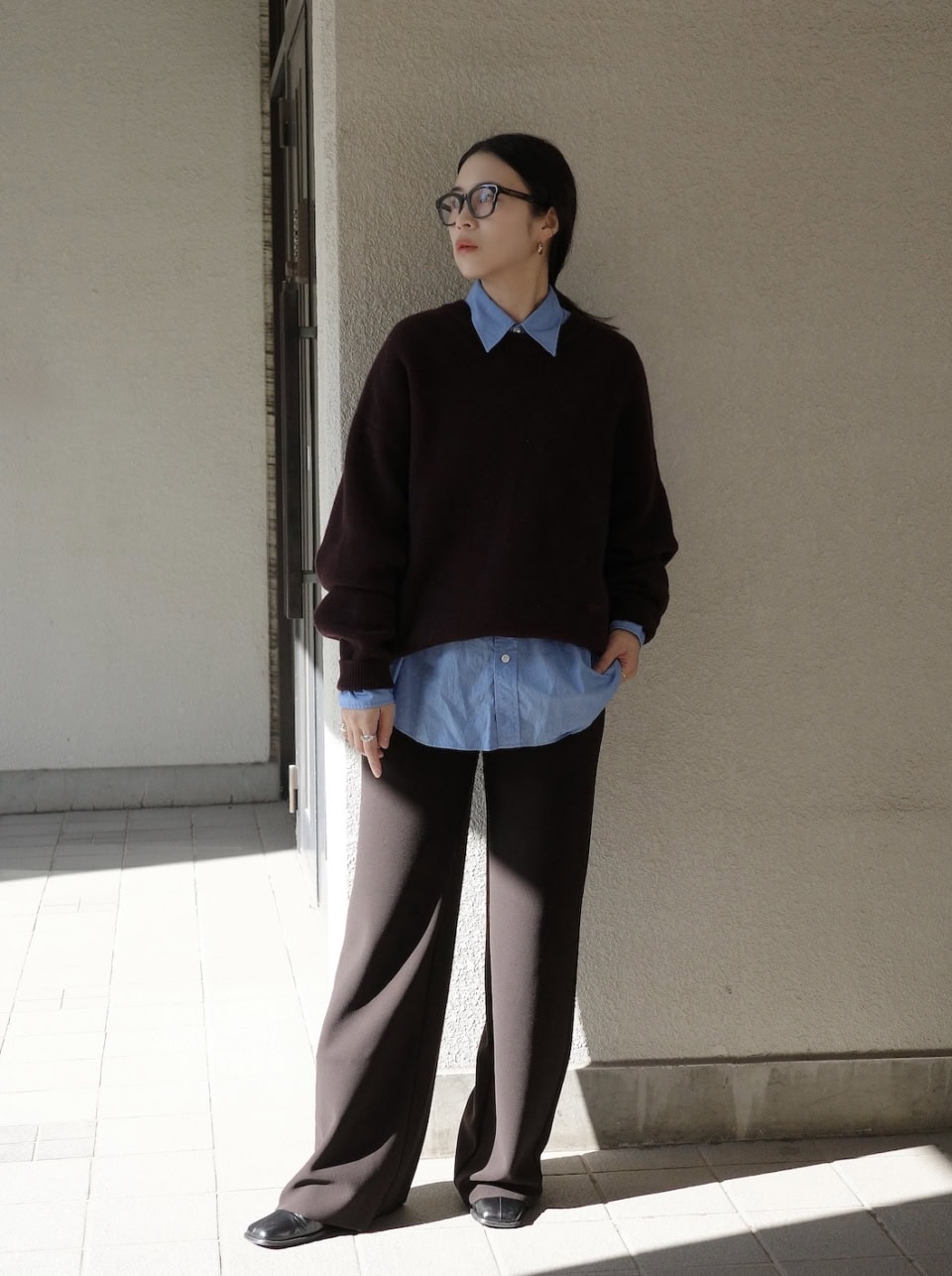 「ニットやパンツの深みのあるブラウンをベースに、ライトブルーのシャツをレイヤードすることでアクセントに。落ち感のあるパンツを合わせることで、ルーズ過ぎないほどよい品をキープしました」