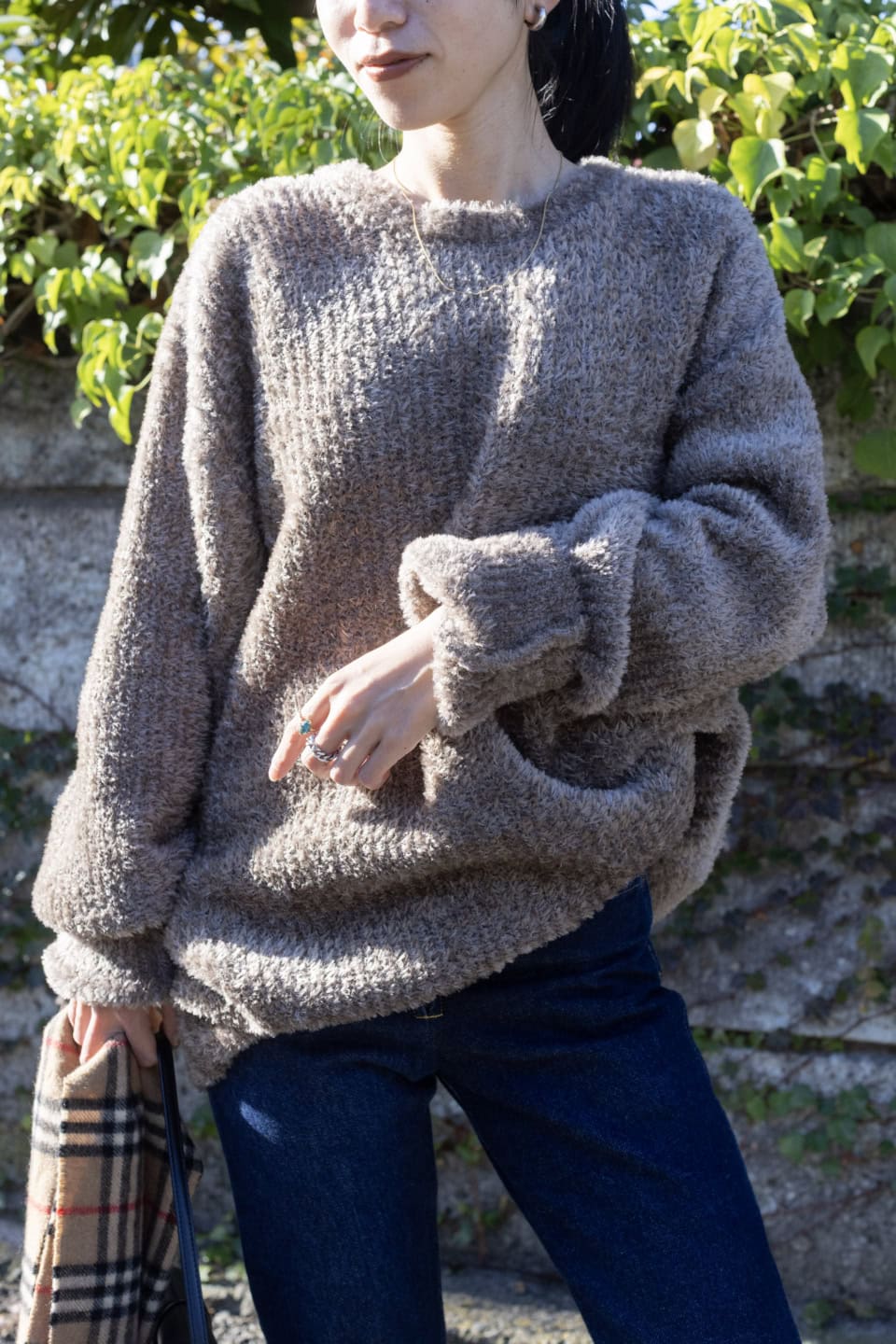 「存在感のある、ふわふわと起毛したようなフェザー調のニットは、あえてオーバーサイズを選びチュニックのような着こなしに。裾のフリンジデザインがポイントのニュアンスデニムと合わせ、休日のリラックスコーデに仕上げました」