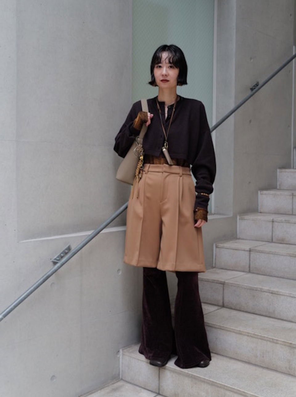 「ブラウントーンのレイヤードコーデは、ボトムスでしっかりとボリュームを出しているため、トップスにはショート丈を選んでシルエットのバランスを整えています。袖にほどよいボリュームがあるニットも、スタイルのアクセントに」