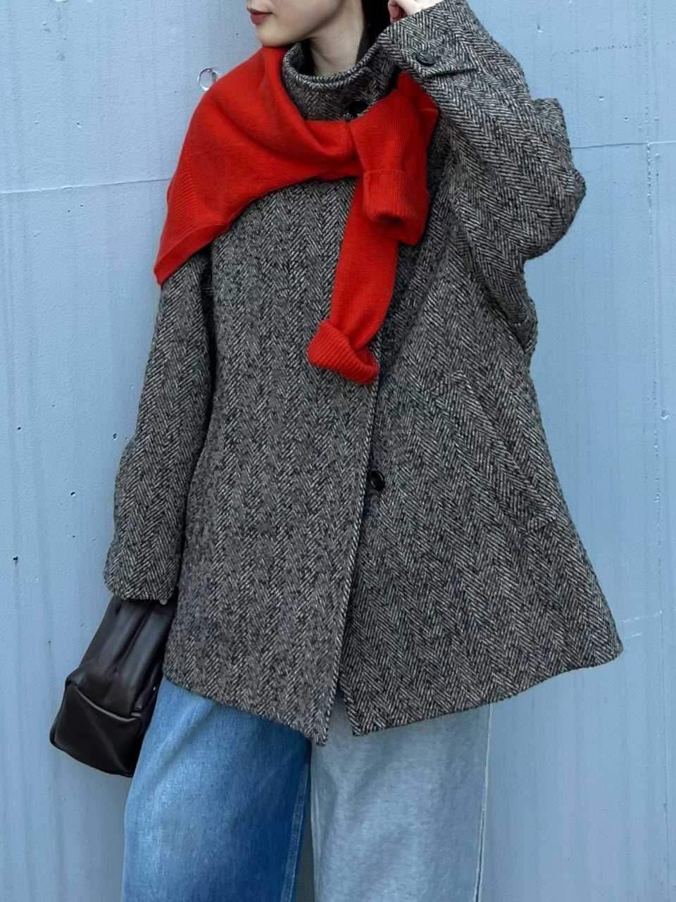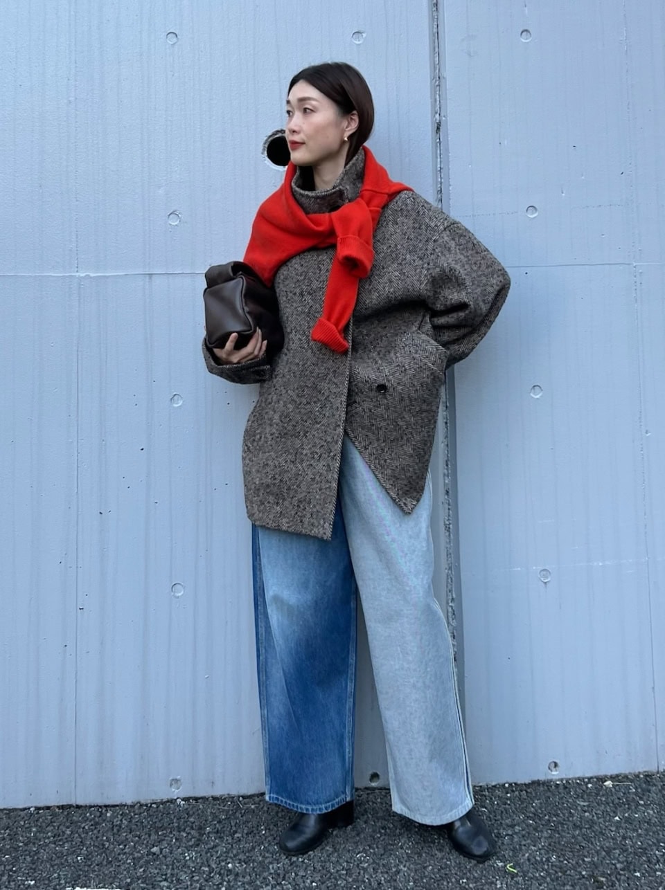 「イタリア製のへリンボーン生地をたっぷり使用したコートは、ワイルドなムードもあり、ONとOFFどちらでも活躍してくれる1枚。今日は完全にOFFなスタイルで仕上げました。ボトムには左右デザイン違いのデニムを合わせ、さらに顔回りには防寒しながら華やかさをプラスしてくれる、明るいカラーのニットを肩に巻きアクセントにしました」