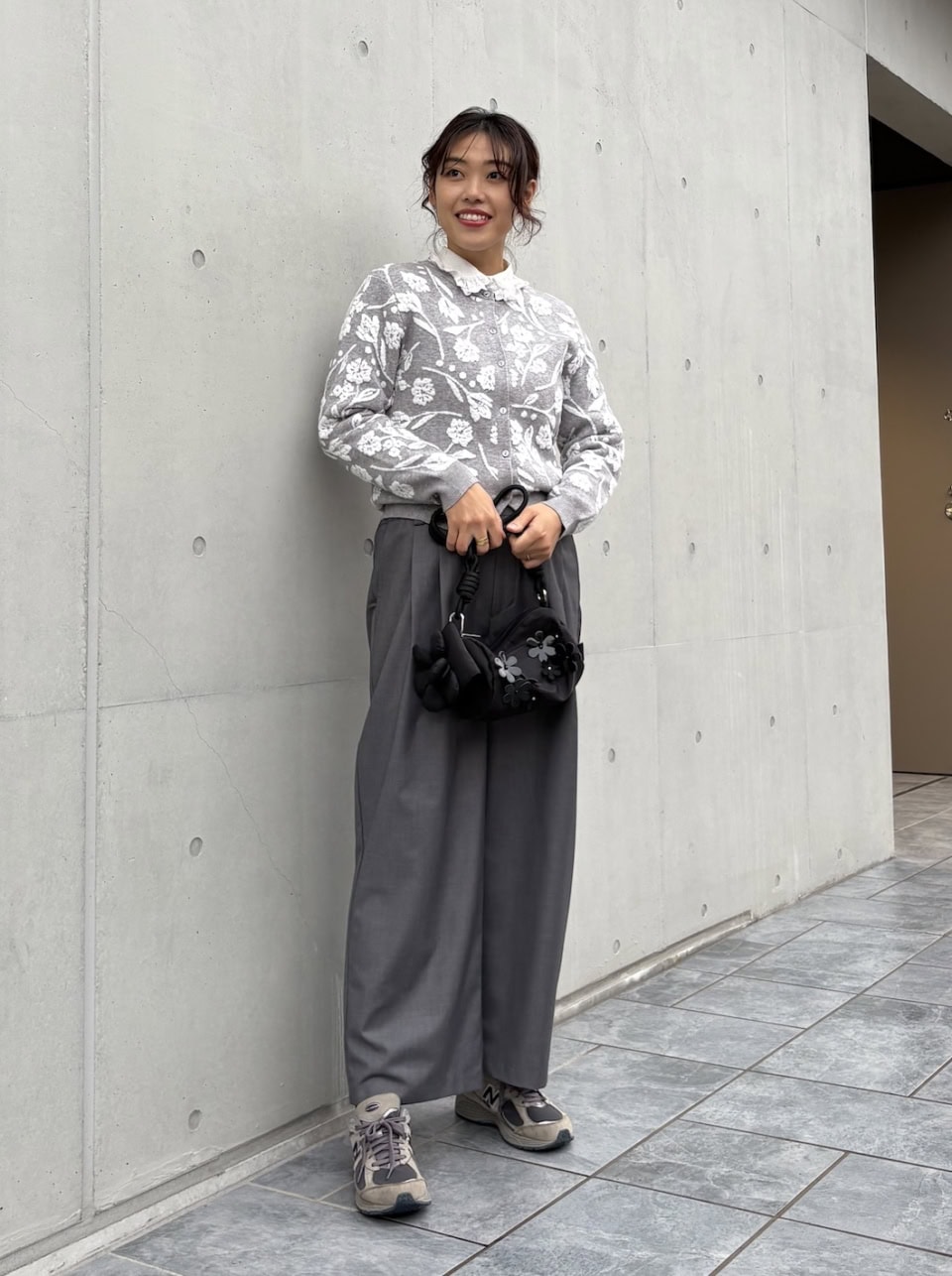 【40代スナップ】全身グレー、でもニットは花柄。シックな中に大人の遊びゴコロを|栗原澪さん