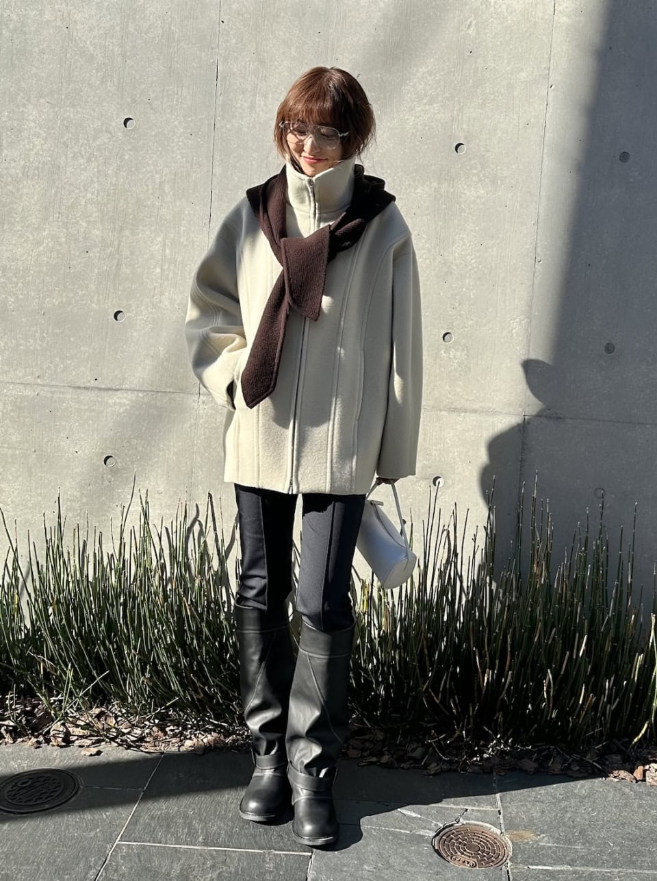 「バラクラバを取り入れるだけでいつものアウターもグッと今季らしいスタイルに。細めのパンツにボリュームのあるブーツを合わせることで、メリハリをつけました。アクセントになるシルバーのメガネでエッジを効かせたのもポイントです」