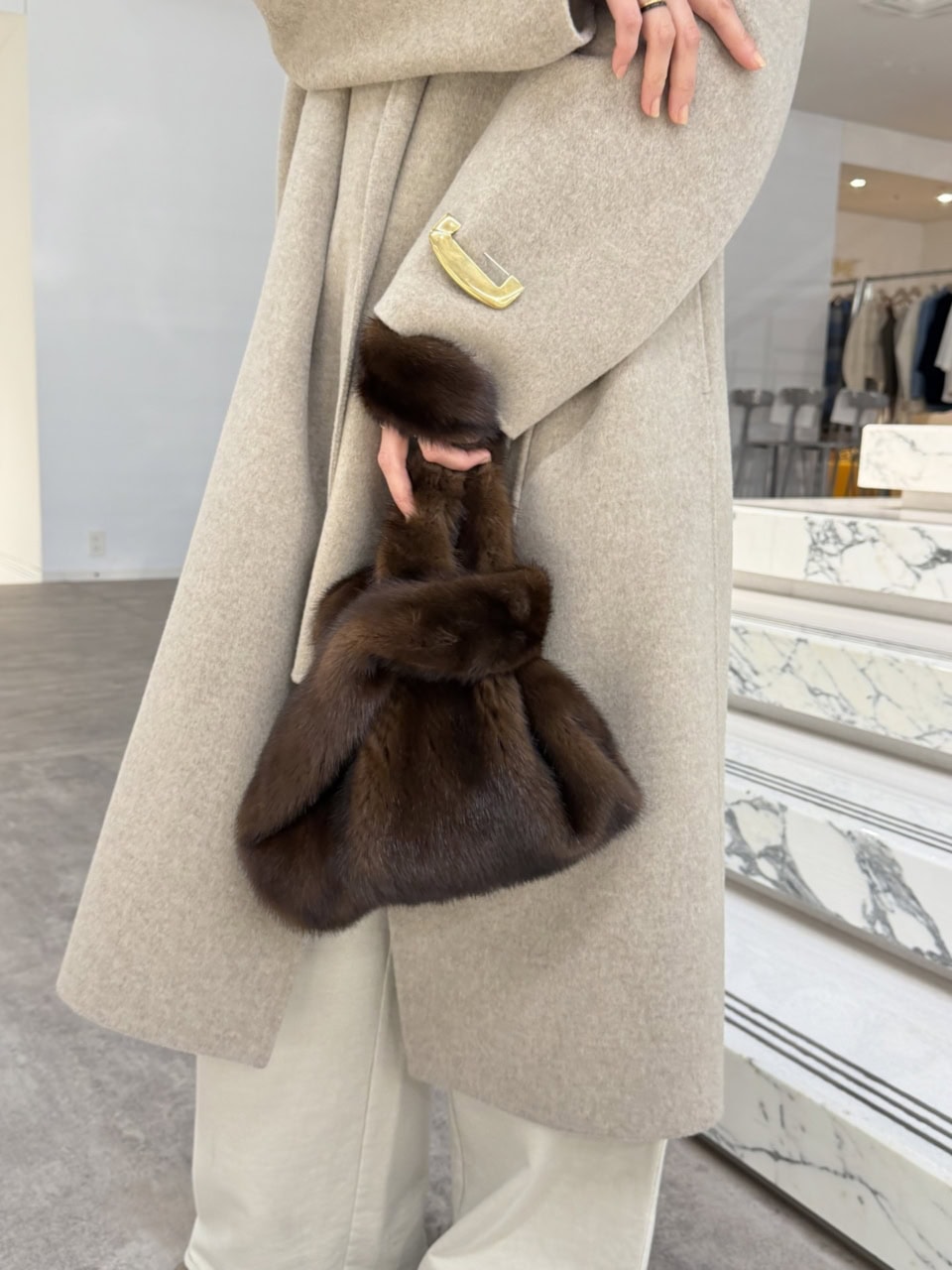 「毛並みのいい上質なミンクを使用したファーバッグ。ラフなデザインとの絶妙なバランスで、大人のスタイリングに遊びを効かせてくれるところが気に入っています」バッグ¥187,000(シモネッタラヴィッツァ/Plage 代官山店)