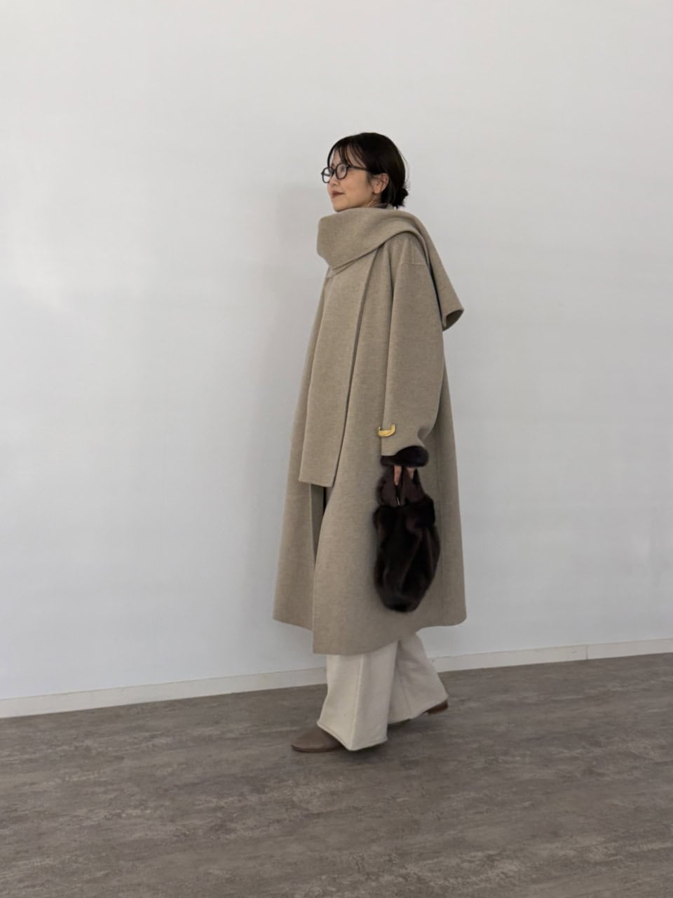 「スタンドネックデザインに惹かれがちなこのごろなので、ジップアップスエットのセットアップにミニマルなコートを羽織り、Plageらしいベージュでまとめてみました。そこにミンクファーバッグで素材とカラーを効かせ、スタイリングを引き締めています」