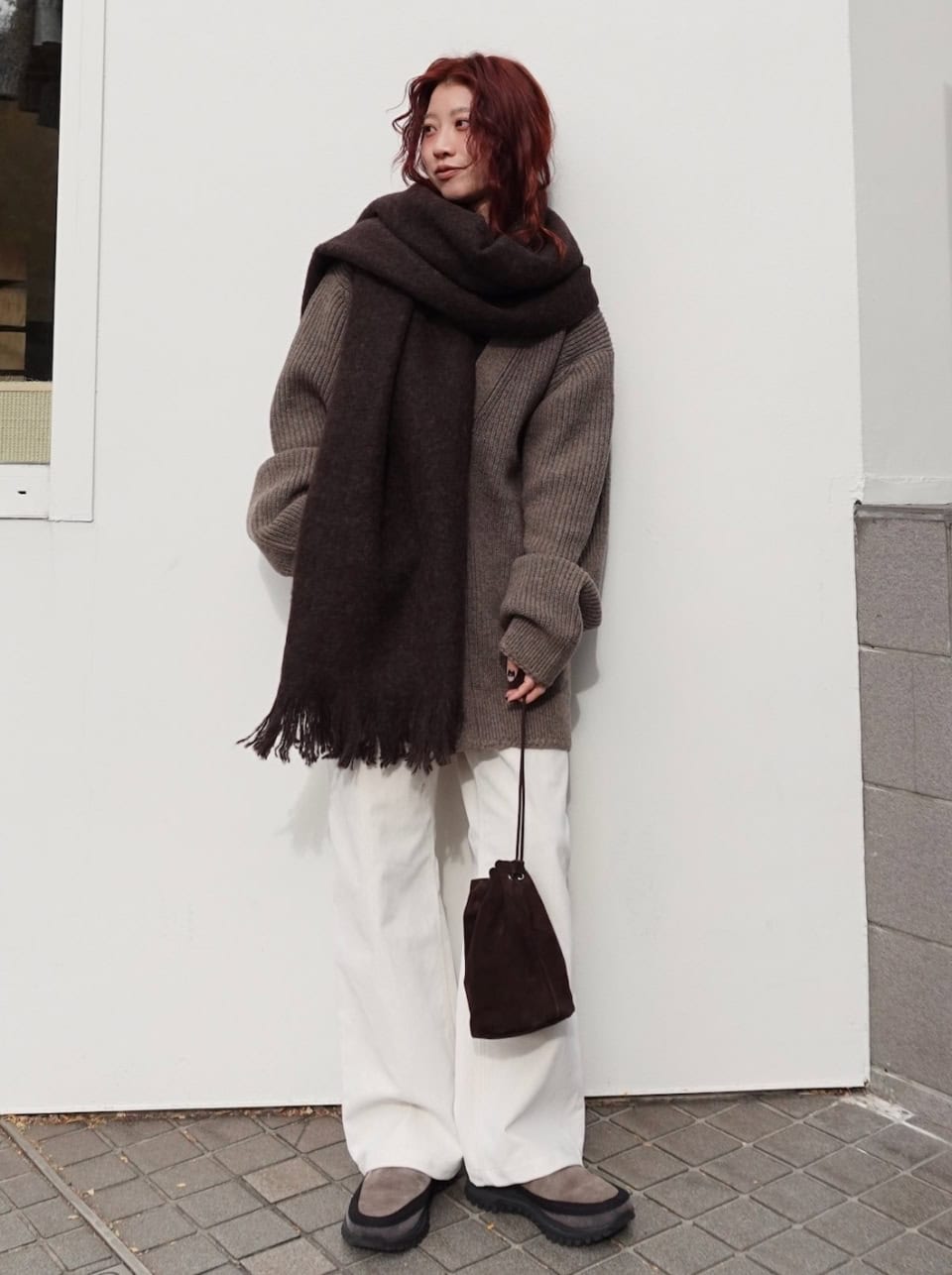 「ボリュームのあるストールを主役に、全体的に落ち着いたトーンでまとめました。パンツを白にすることでブラウンコーデにヌケ感をプラスしています」