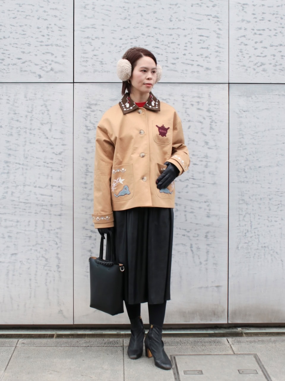「やさしいバイカラーのイヤーマフを主役に、刺繍がポイントのジャケットを合わせて、エレガントの中に遊びをプラスしたコーディネートにしました。カジュアルになり過ぎないように、上品なブラックのレザーのグローブとバッグを取り入れたのがポイントです」