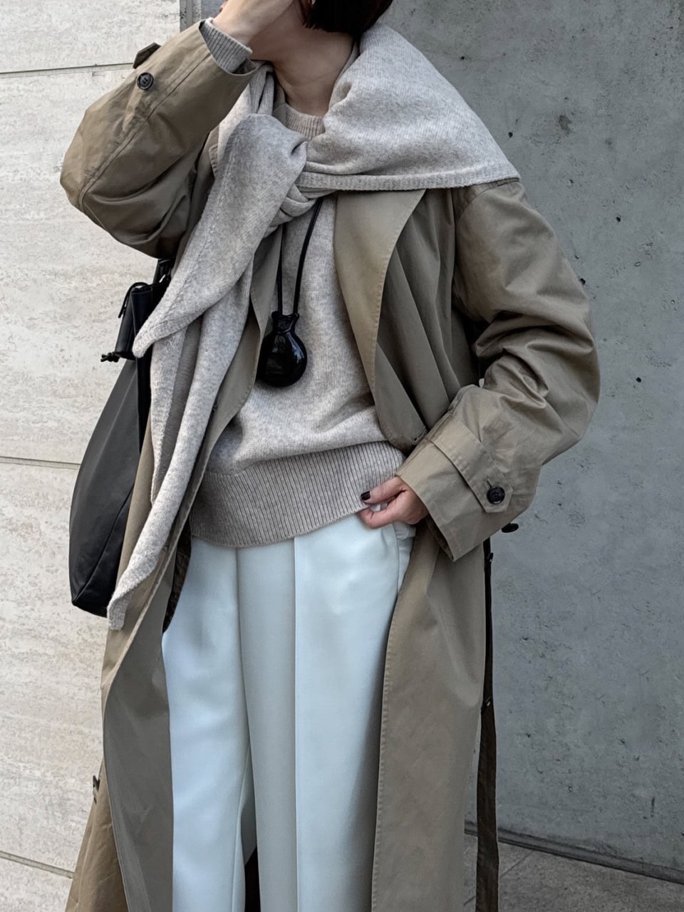 「シンプルなベージュトーンのスタイリングに、ボリュームのあるニットストールを合わせてトレンド感のある着こなしに仕上げました。あえてブラックの小物を取り入れることでスタイリングを引き締めつつ、遊び心もプラスしています」