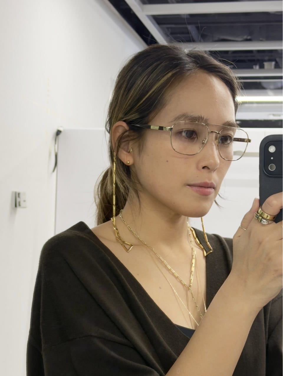 「洒落顔に仕上げてくれるGUCCIのメガネはこれから大活躍の予感。ゴールドのフレームは持っていなかったのですが、これは黄味が強すぎないので顔馴染みもよく、派手過ぎずにかけられるのが好きなポイントです」メガネ¥52,800(GUCCI/AP STUDIO ニュウマン新宿店)