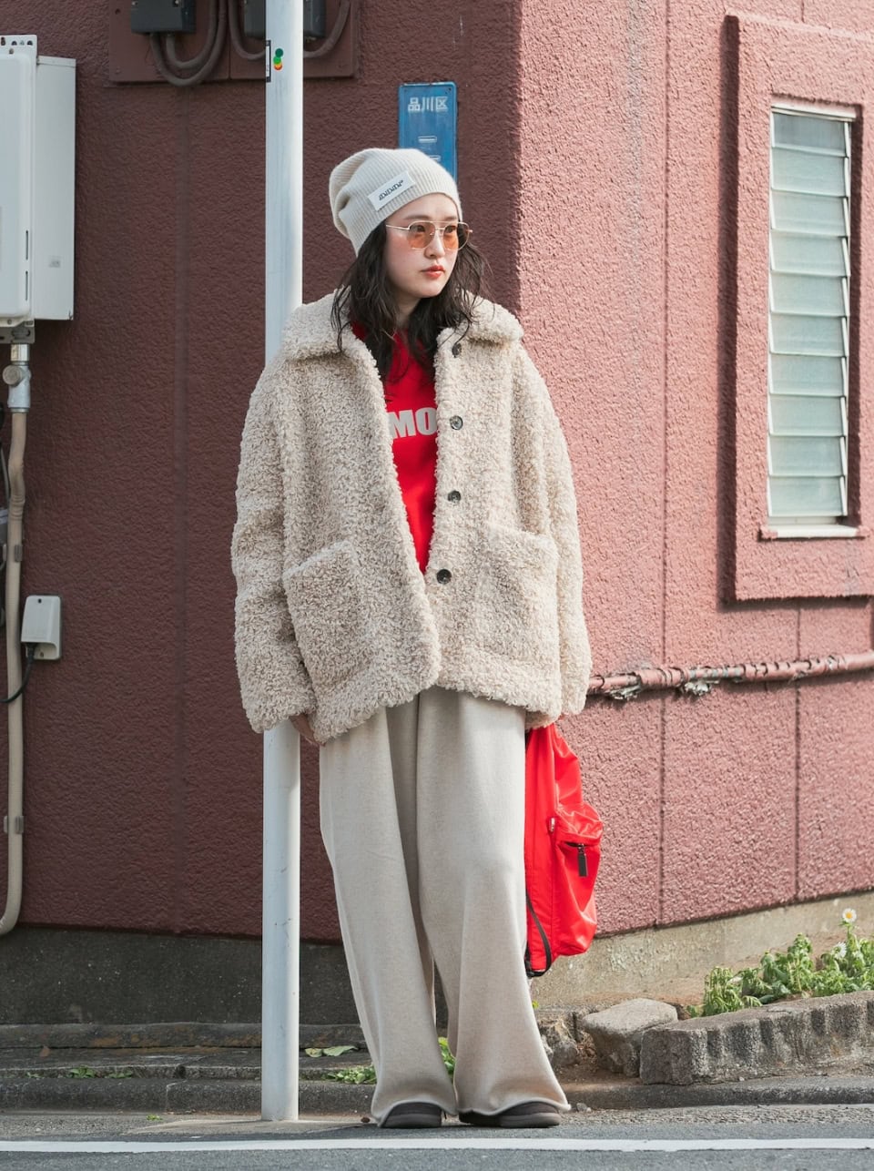 「アイボリーのワントーンコーデをベースに、赤を差し色として取り入れ、メリハリをプラスしました。カシミア素材のビーニーとニットパンツにボアコートを合わせ、柔らかな配色と素材感で、暖かみのあるスタイリングに仕上げました」