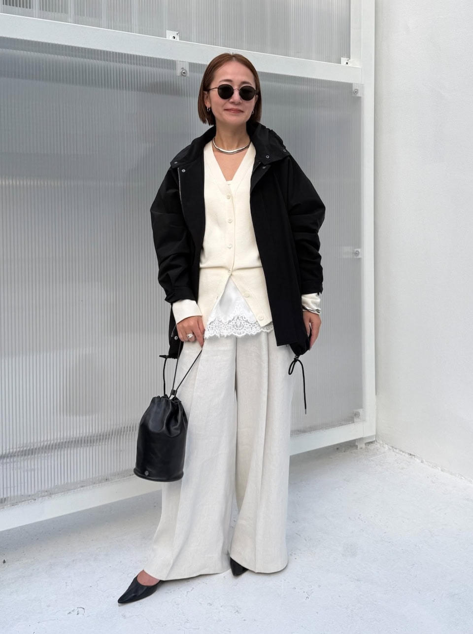 「春のムードを少しだけ意識したホワイトスタイリングは、ニットやレースの素材を入れてヌケ感を出しました。クリーンなホワイトコーデですが、サングラスをはじめ、VACHEMENTの別注ブルゾンやTHE ROWのバッグとシューズでブラックを投入し、引き締めているのがポイントです」