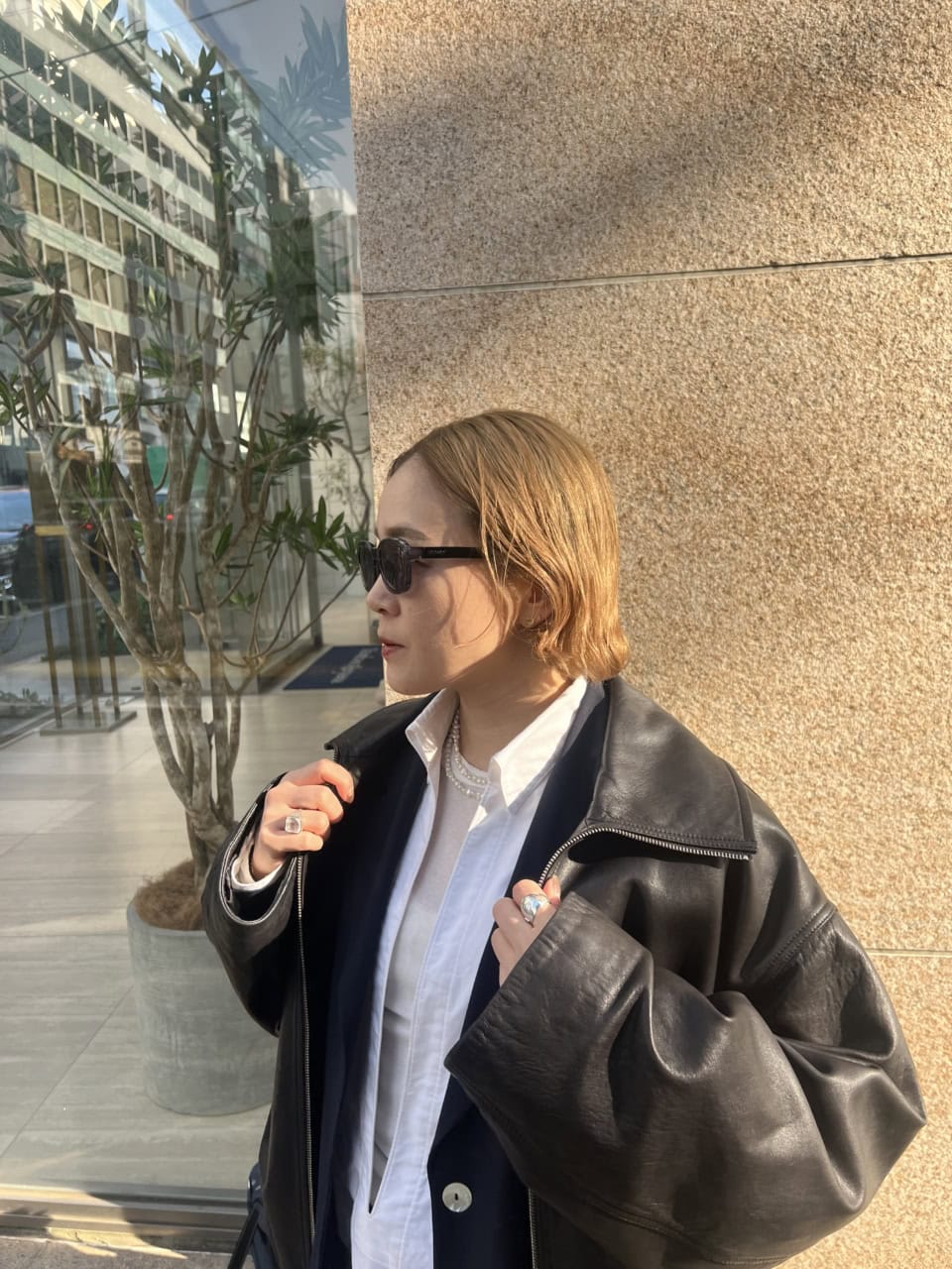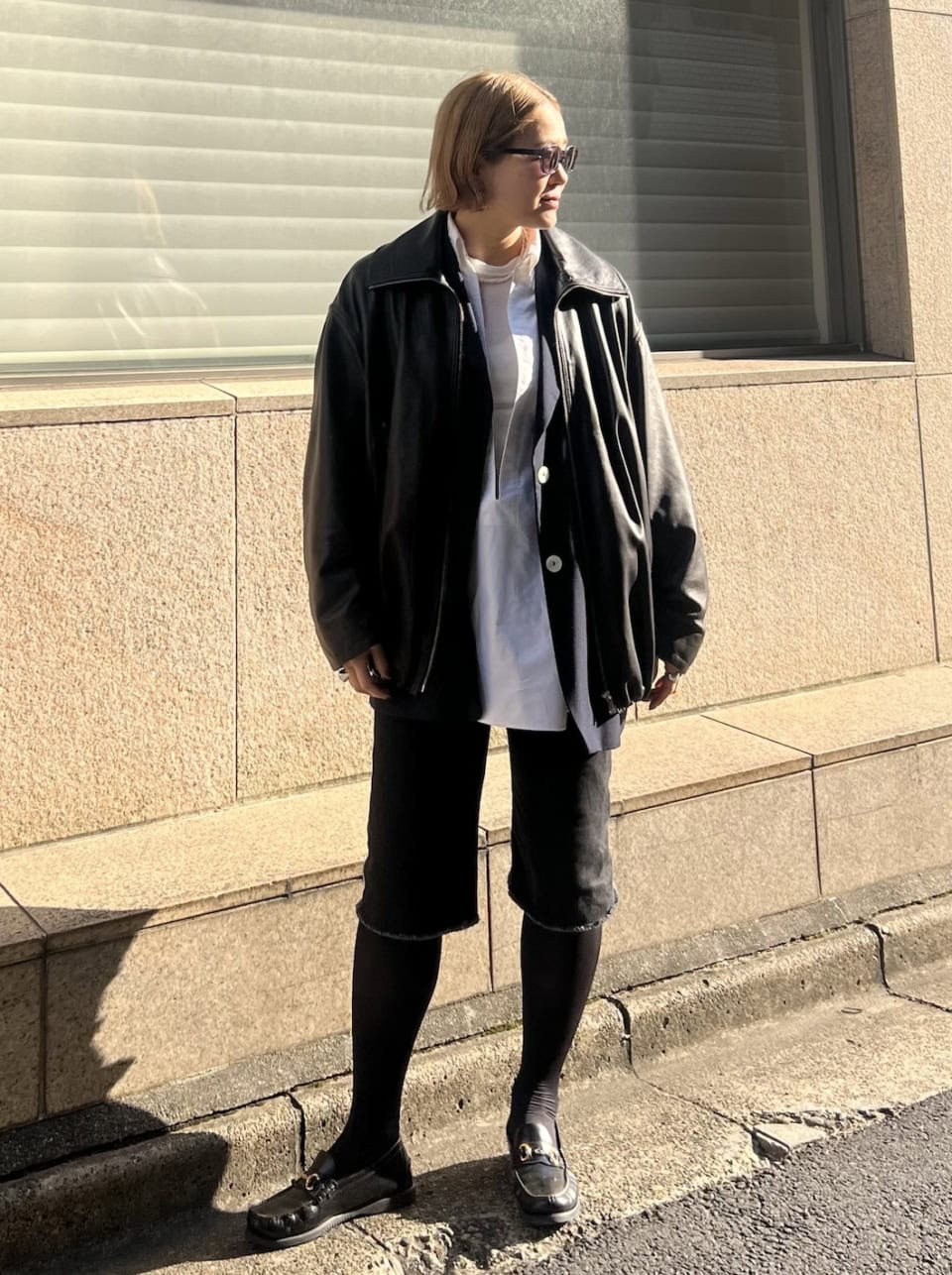 「春の気配を感じるある日のスタイリング。ボトムはハーフパンツでスッキリとまとめ、その分トップスはレイヤードを楽しみました。軽いかけ心地のサングラスはデイリー使いしていて、ネイビーのフレームがコーデのアクセントになってくれます」