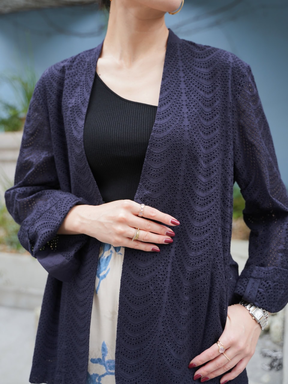 【40代スナップ】カーデのような「レースジャケット」がオンオフ共に大活躍します|長谷川直美さん