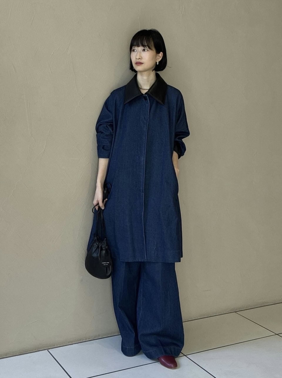 「アウター×パンツという組み合わせが新鮮な同素材セットアップに、ワインレッドのミニマルなシューズを合わせました。定番ですがデニムと赤はやっぱりかわいいの組み合わせ。レザーのステンカラーの色に合わせて、バッグもブラックのレザーで繋げたところもポイントです。ブラックパールの極小ネックレスもお気に入りのアイテム!」