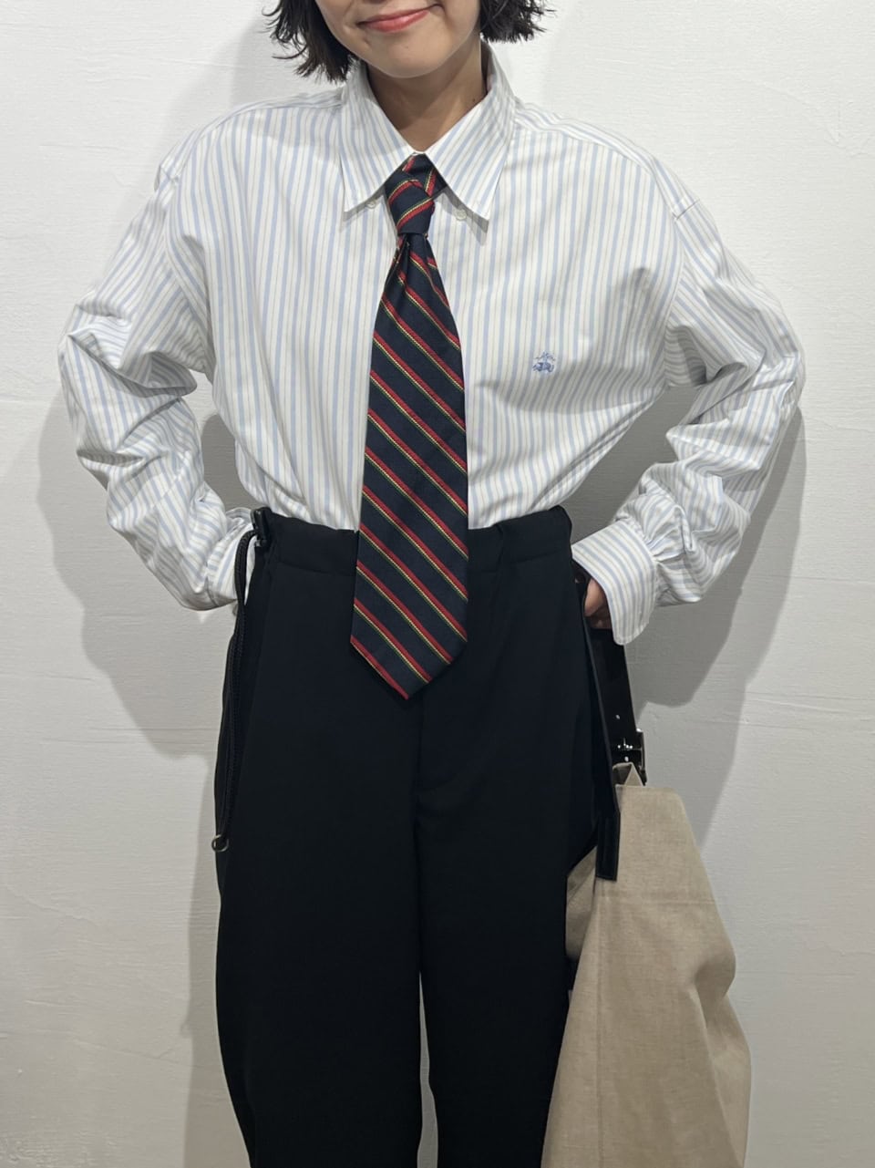 「⽇常的なプレッピースタイルを意識してシャツとネクタイをメインにスタイリングしました。足元にはラフなコンフォートシューズを合わせ、キャンバス素材のバッグを持つことで⼒の⼊り過ぎないコーデにまとめています」