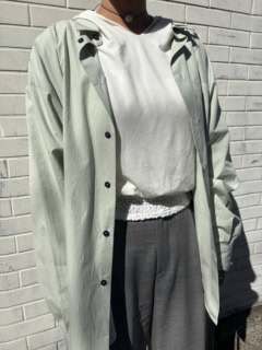 「春らしいカラーのストライプシャツに、シアーなフーディを合わせたレイヤードスタイル。キャミソールのレースをチラッと見せて、カジュアルだけど奥行きのあるコーデに仕上げました」