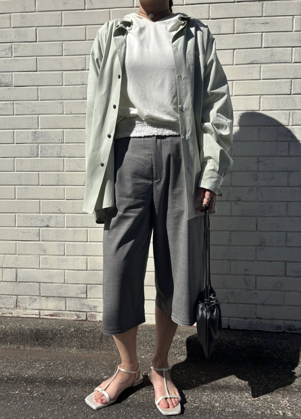 シャツ¥22,000、サンダル¥17,600(共にトゥデイフル/Life's)、レースキャミソール¥18,700(アー・アン)、トップス¥26,000、パンツ¥26,000(共にフィアー)、ララガンのネックレス、その他は全て本人私物