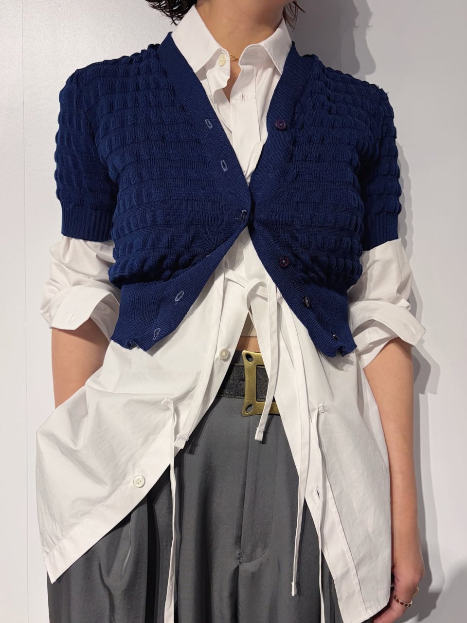 【40代スナップ】遊び心ある「デザイン白シャツ」とちびカーデのバランスがイイ!|早崎和美さん