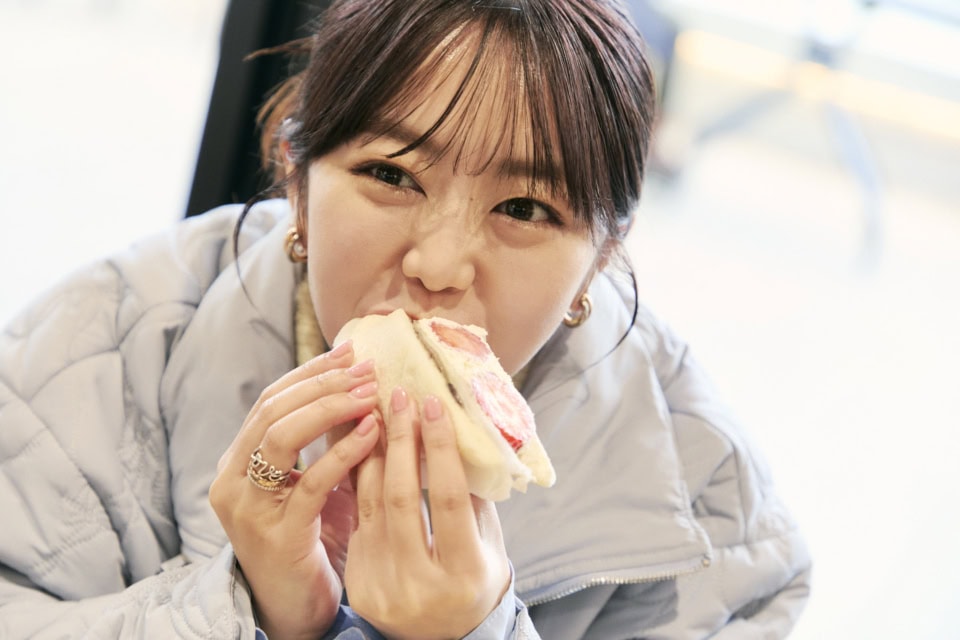 ショーウィンドウに並ぶ色とりどりのフルーツサンドに足を止めずにはいられない! 愛知県岡崎市で親子三代続く小さな町のスーパー「ダイワスーパー」が手掛ける「ダカフェ」は、三代目店主が手掛ける新形態で大バズリ。全国に知名度を引き上げた看板商品は、その名も「八百屋の作る本気のフルーツサンド」。旬のフルーツを中心にこだわりの素材で作られたメニューの数々はどれも間違いのない美味しさ! 峯岸さんはこの日初めて食べるという季節限定の苺大福をチョイス。