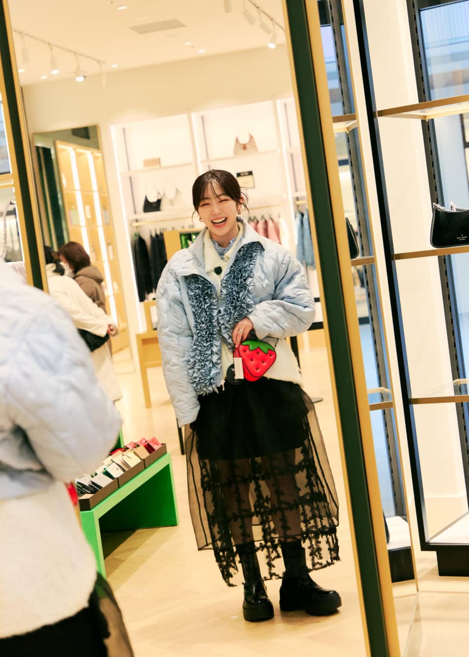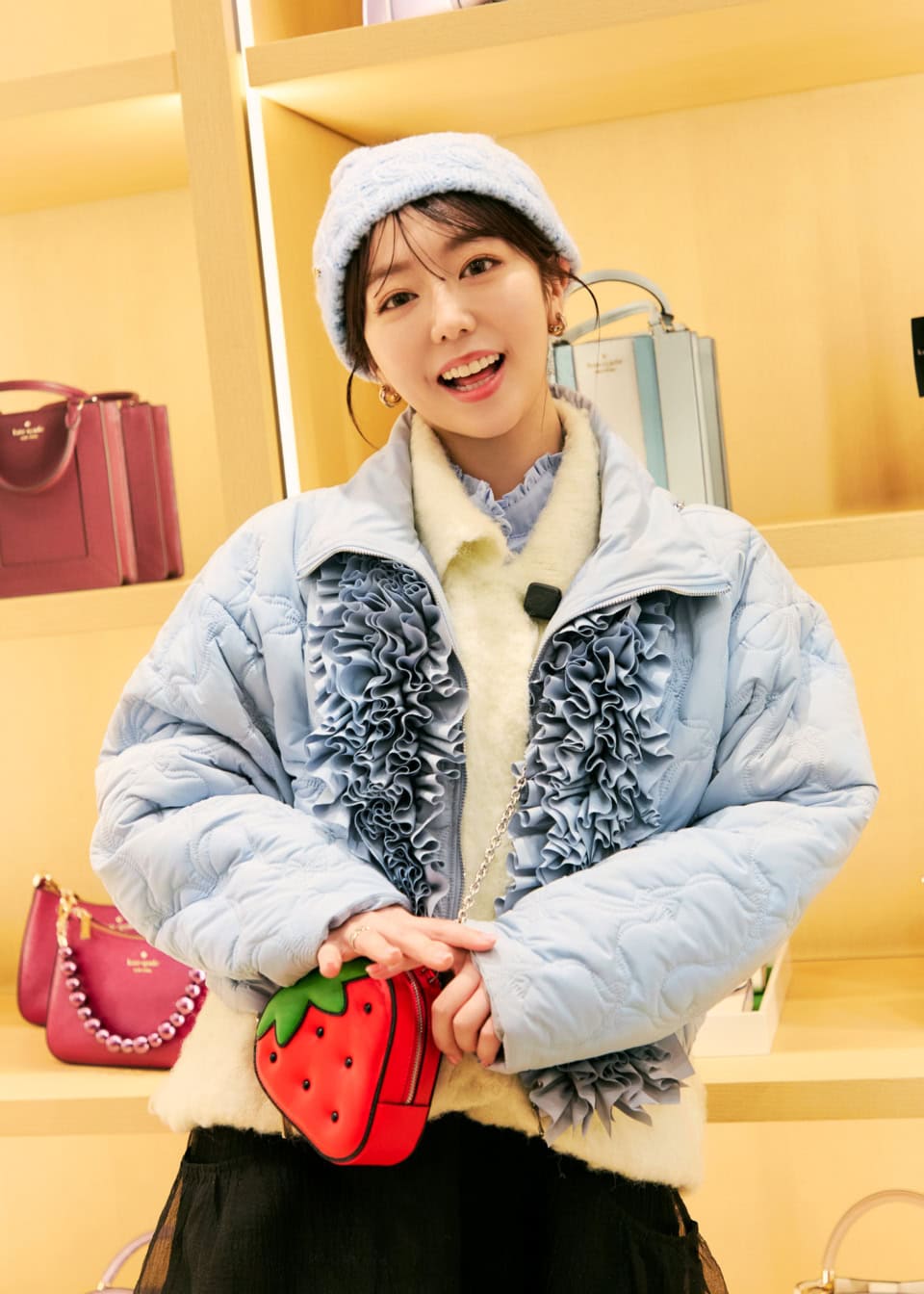 コートと同じ淡いブルーカラーのニット帽と、いちごのバッグをお買い上げ。