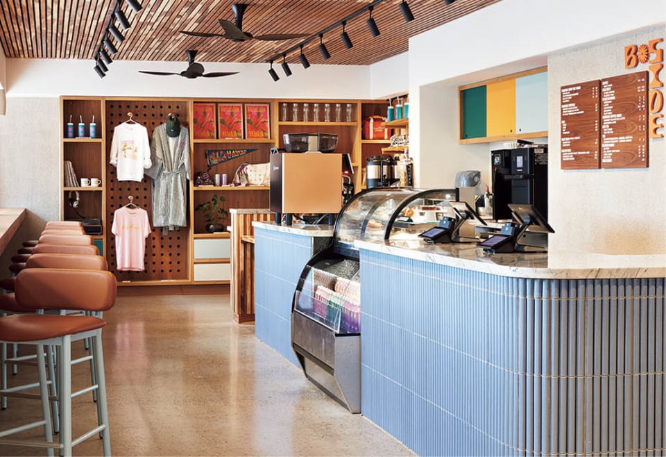 ロビー脇には、マウイ島で焙煎された「Social Hour Coffee」の豆を使うコーヒーショップと、ホテルオリジナルのグッズが並ぶショップが併設。滞在の記憶を持ち帰る、お土産探しにも最適です。