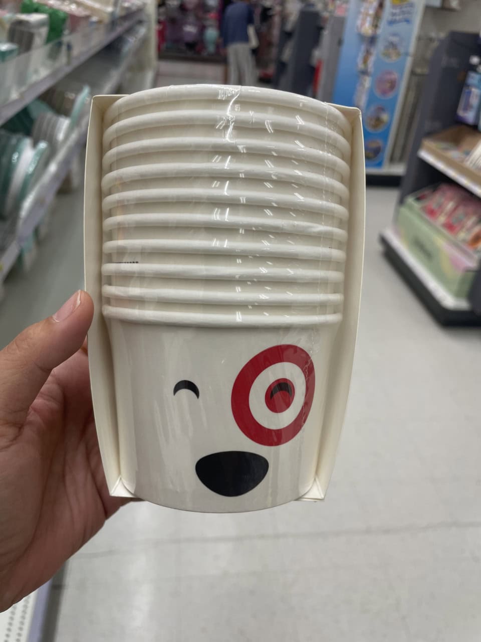 ブルズアイ君が笑ってるー! カップはスープ用にちょうどいいかも。ペーパーディッシュ、ペーパーカップ各3ドル(約465円)。