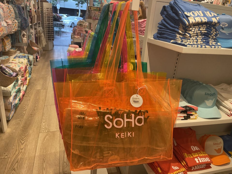 それがこちら。カイルアを散策していると見つけられる『SoHa Living』というハイセンスなハワイアイテムが満載のお店の、キッズ版『SoHa keiki(ソーハケイキ)』の限定アイテムです。全色揃っていると可愛さも倍増。スモールとラージの2サイズ展開で、お手ごろプライス。色はスモールがピンク、クリア、イエロー、グリーン、ブルーの5色。ラージはピンク、オレンジ、イエロー、グリーン、ブルーの5色。ビーチバッグにはもちろん、日本に帰っても夏のコーディネートにも合いそう。ママとキッズとお揃いで持つのもアイディアですよね。