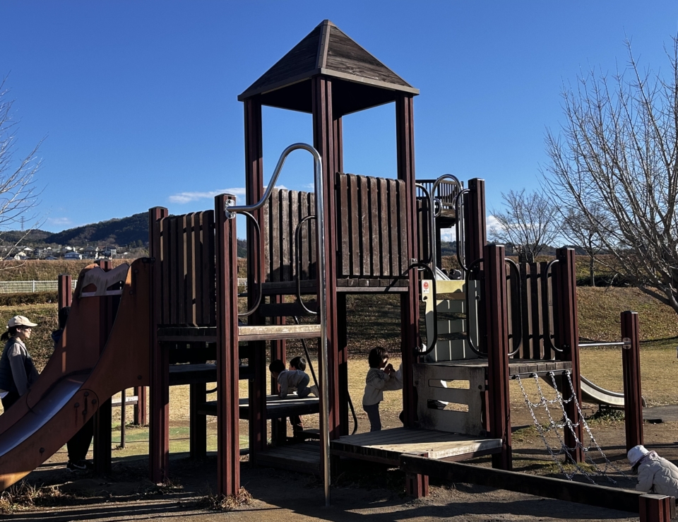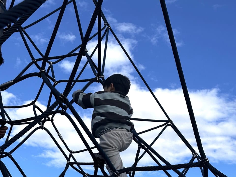 子連れにオススメしたい近くの公園。広い園内には滑り台、ピラミッド型のネット、ターザンロープなどの遊具もあり、ガッツリ遊べました。無料駐車場あり。