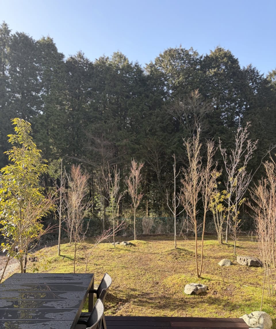 リビングと裏庭をシームレスにつなげるデッキ。まわりの視線が気にならないのも◎