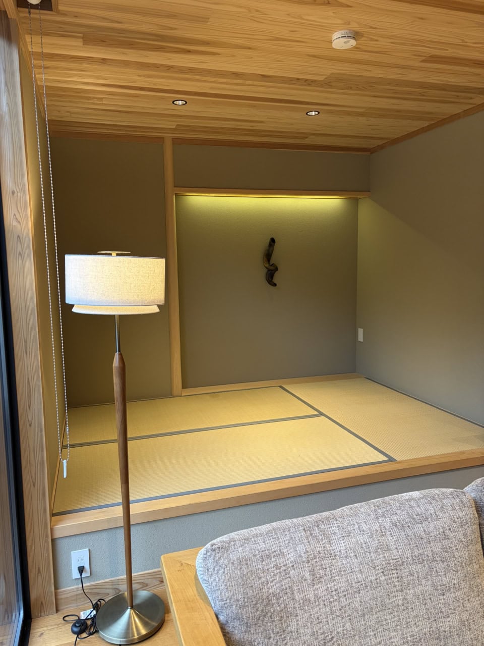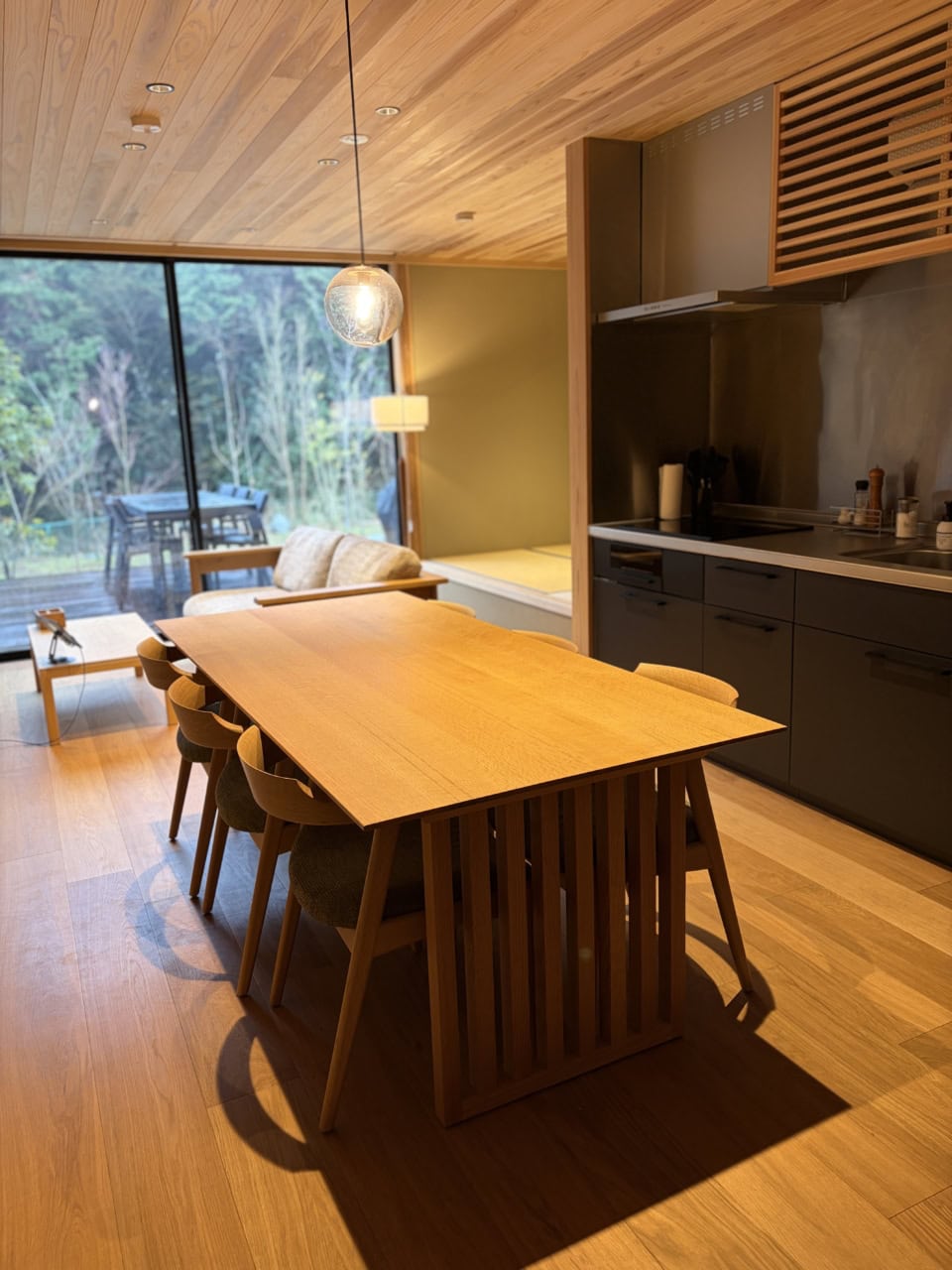 滞在中、ほとんどの時間をこちらのリビングダイニングで過ごしていたほど、本当に居心地がよかったです。ダイニングテーブル&チェアもゆったりとしていてくつろげるし、お酒があればいつまででもおしゃべりできちゃう感じです(笑)。で、食事後にはムーディーなダウンライトに切り替えれば完璧! お部屋はウッドと硫黄の香りに包まれていて、それもまた心地よく、すごく落ち着きました。